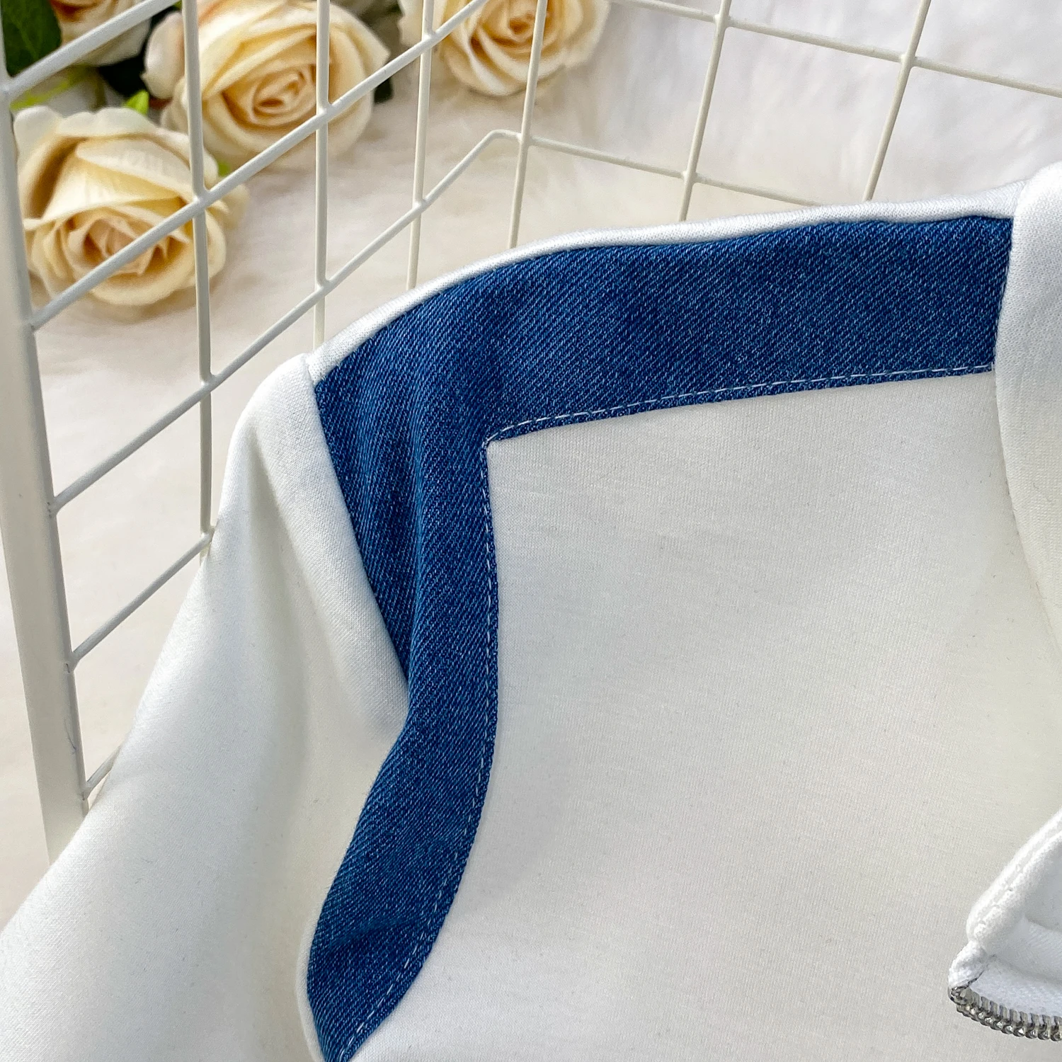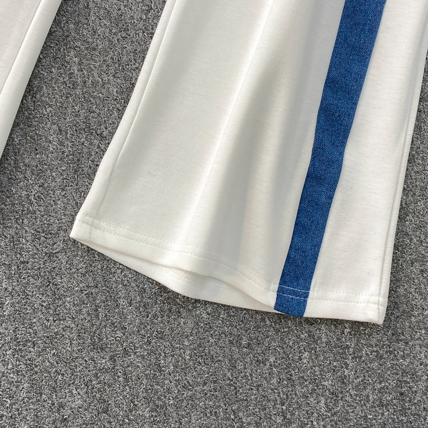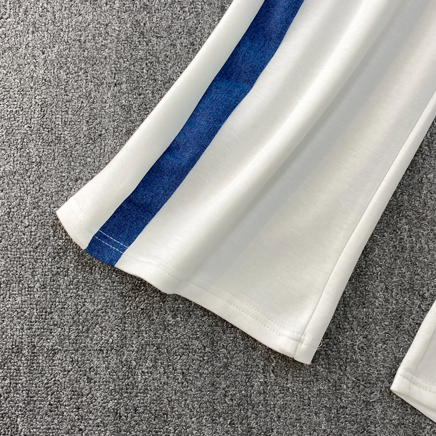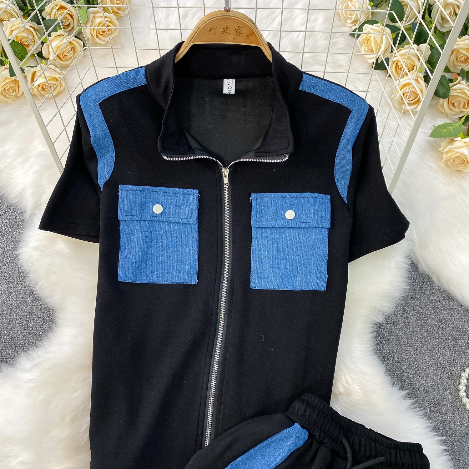 2025 New Casual Zipper Collar ort Sve Patchwork Denim T-irt Top High Waist Slim Wide Leg Pants Two Piece Set Women's F...