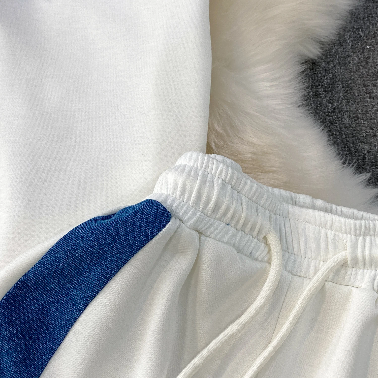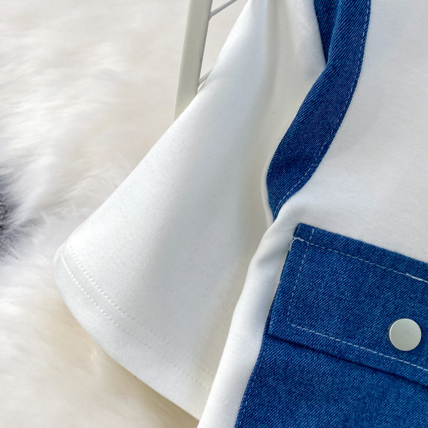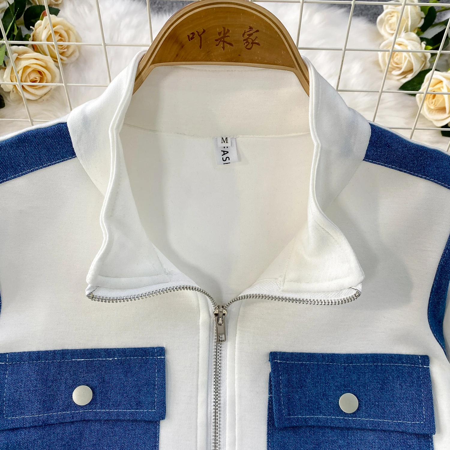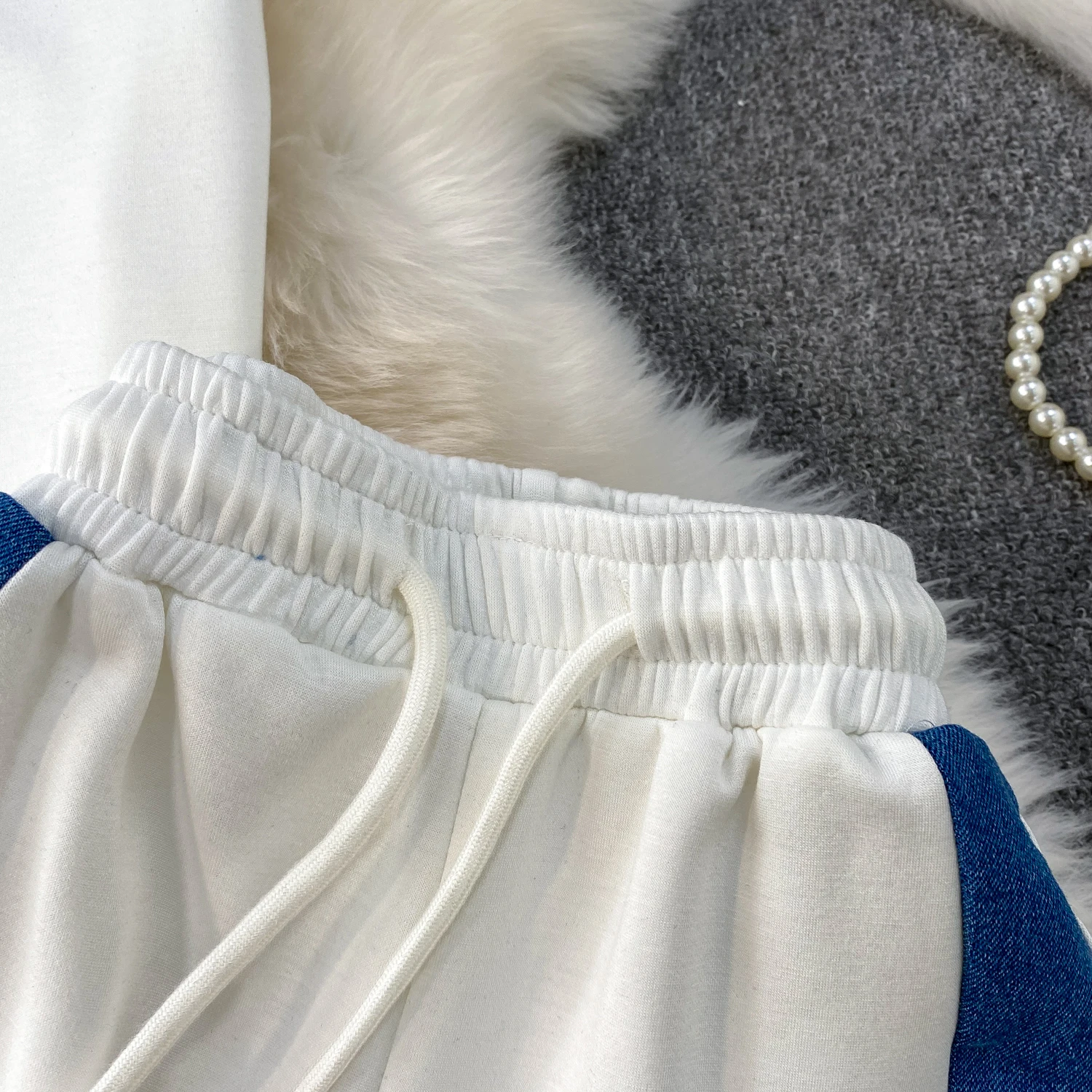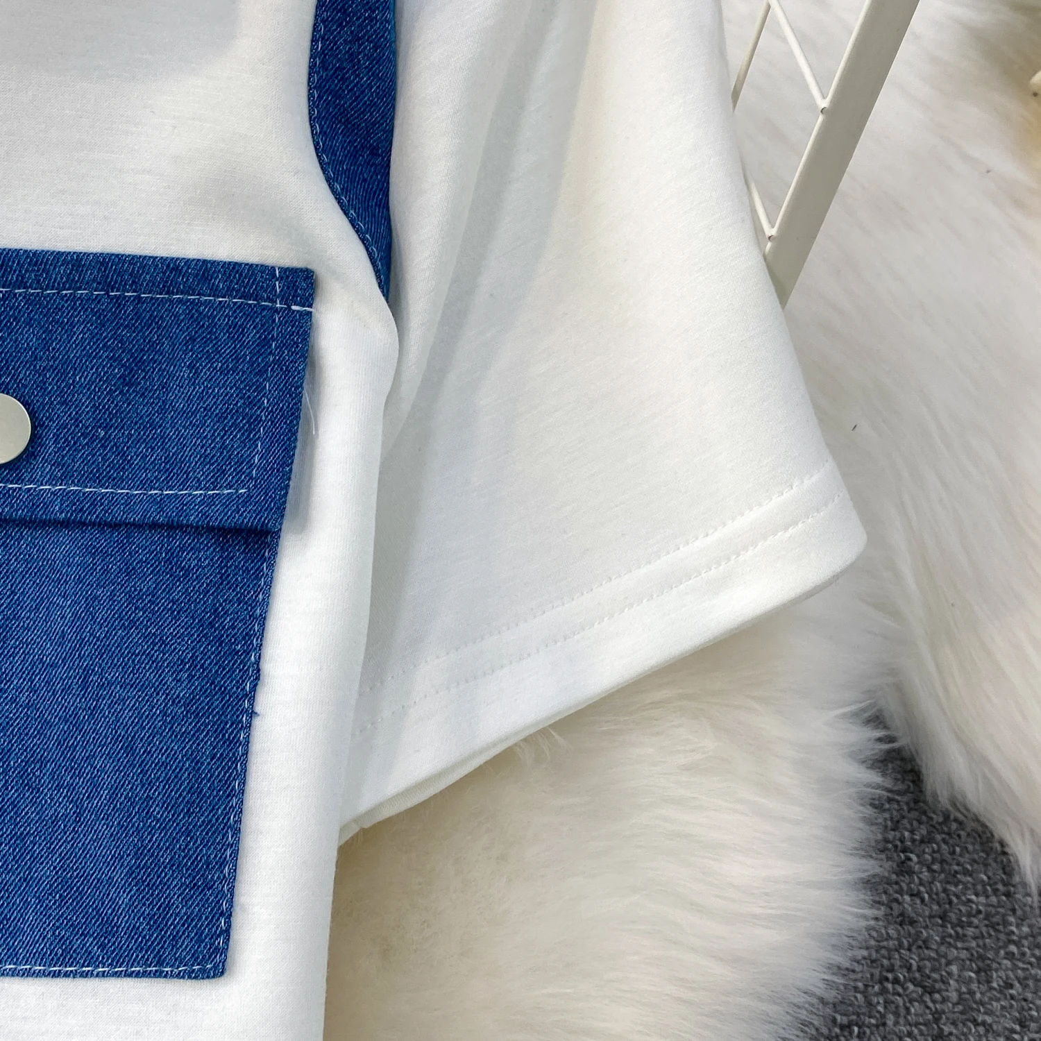 2025 New Casual Zipper Collar ort Sve Patchwork Denim T-irt Top High Waist Slim Wide Leg Pants Two Piece Set Women's F...