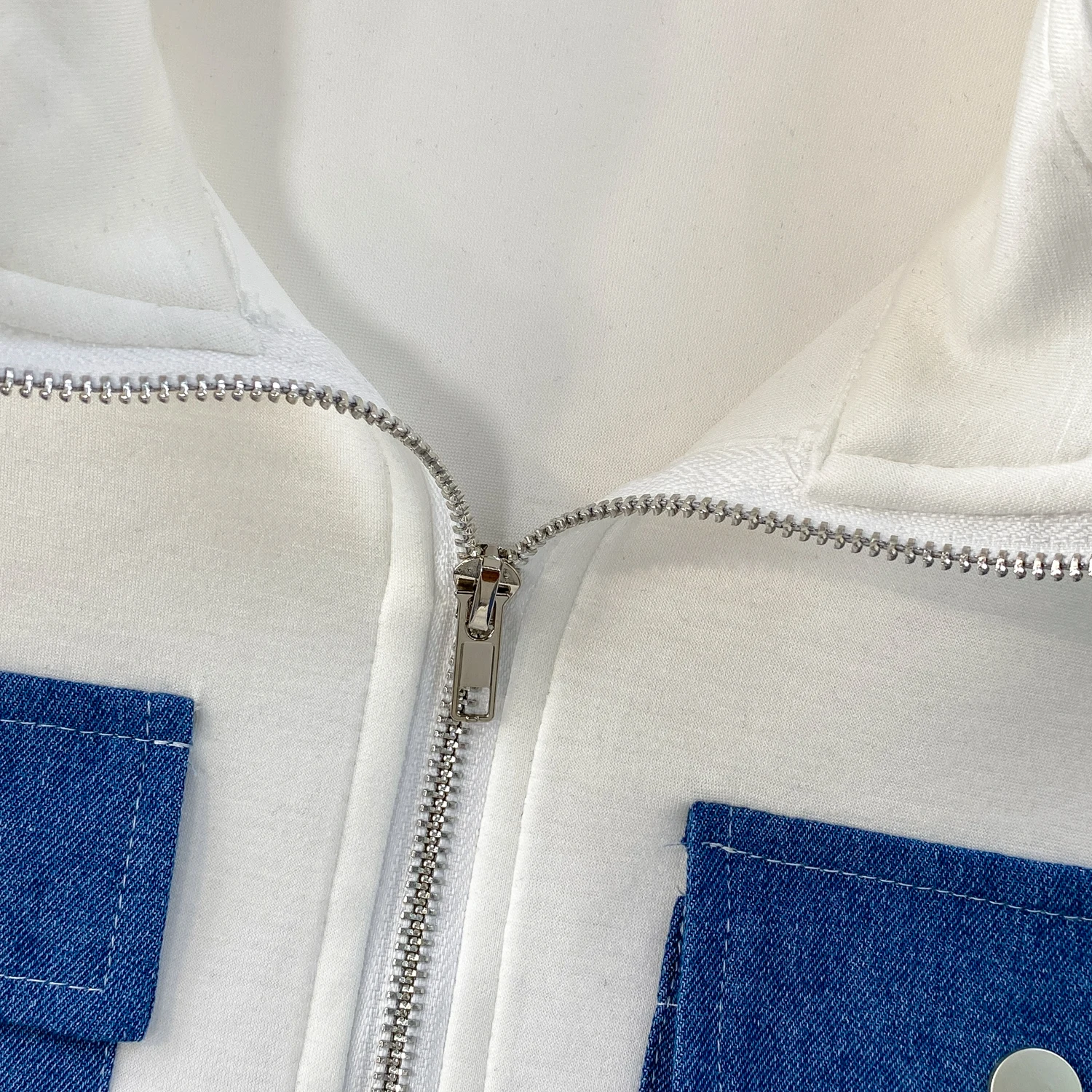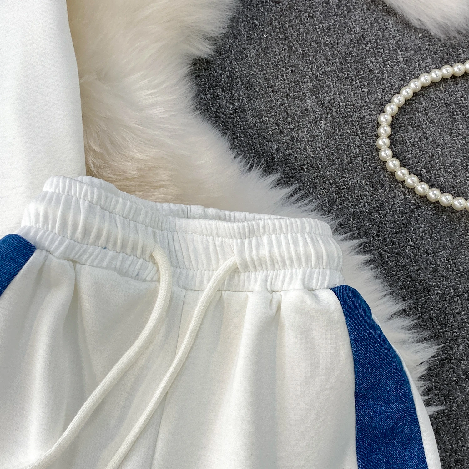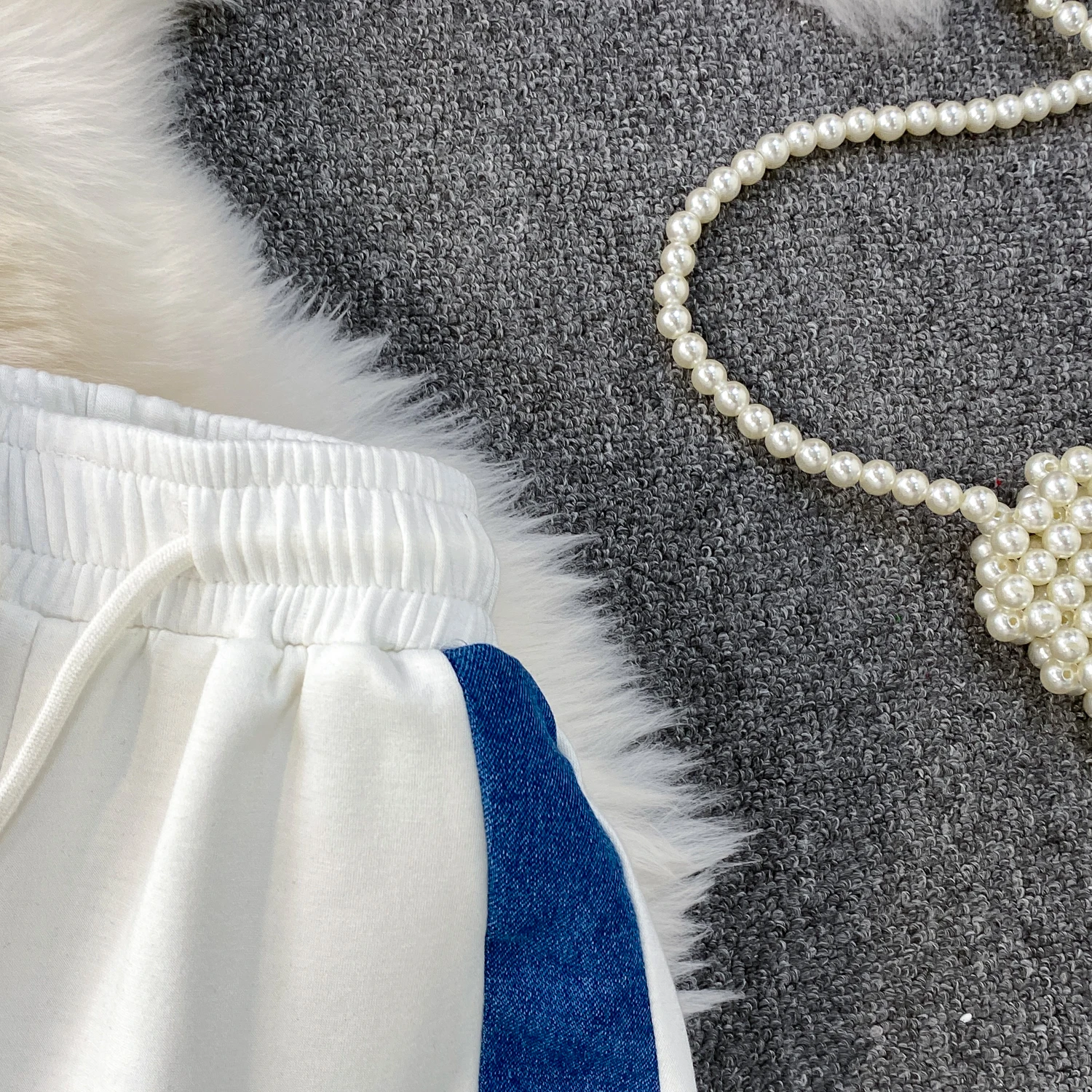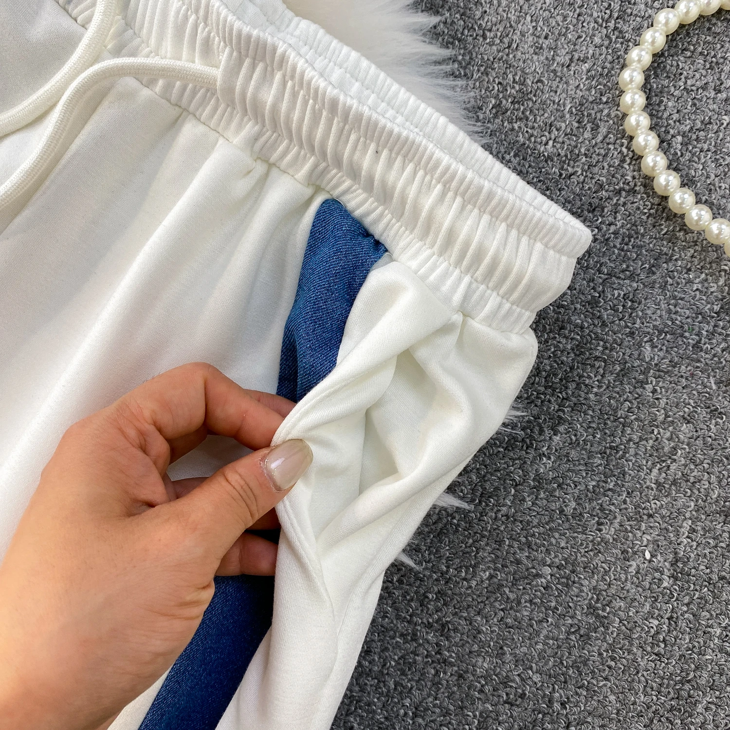 2025 New Casual Zipper Collar ort Sve Patchwork Denim T-irt Top High Waist Slim Wide Leg Pants Two Piece Set Women's F...