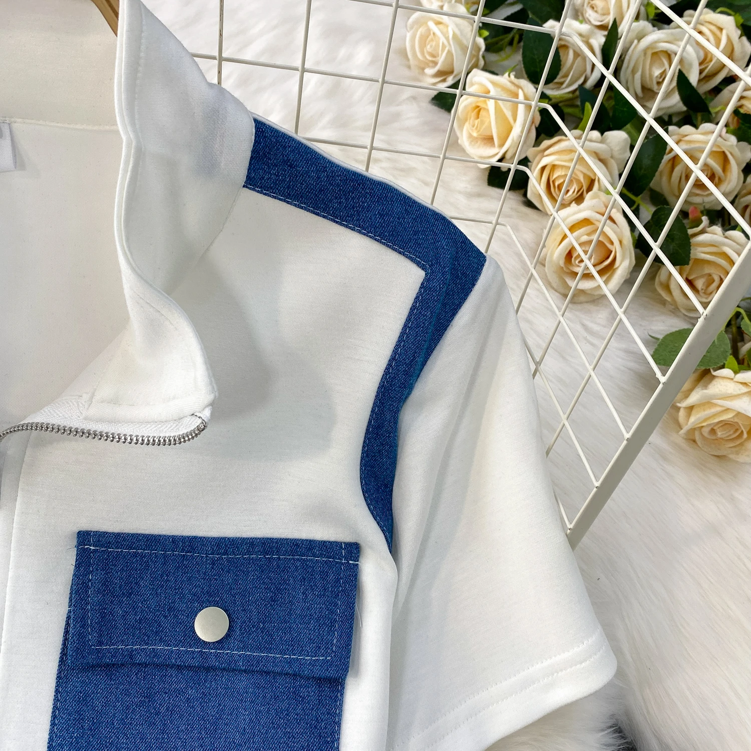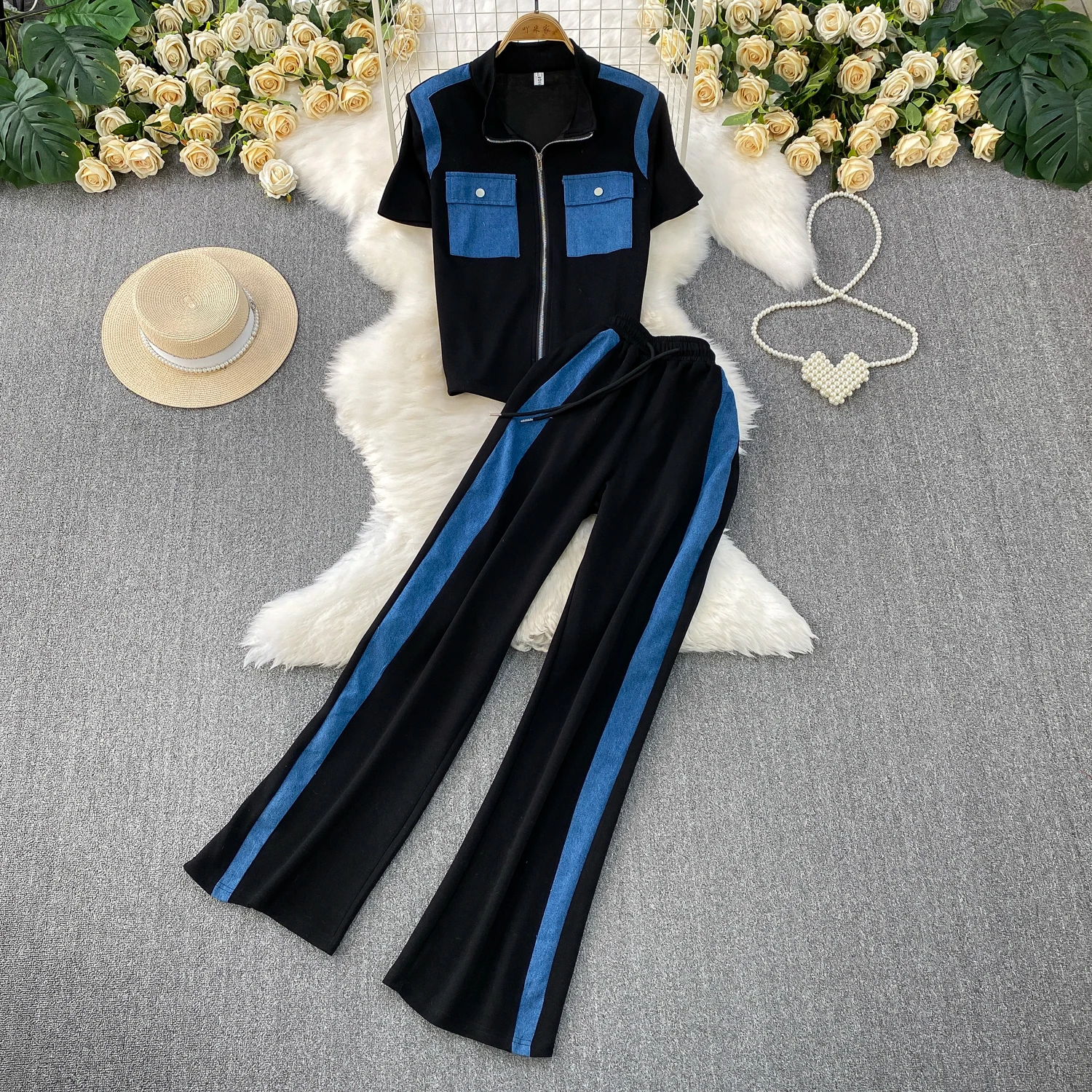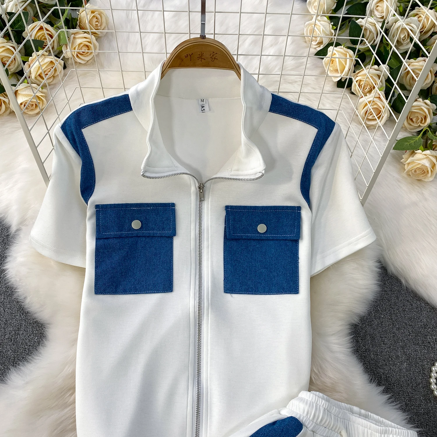 2025 New Casual Zipper Collar ort Sve Patchwork Denim T-irt Top High Waist Slim Wide Leg Pants Two Piece Set Women&