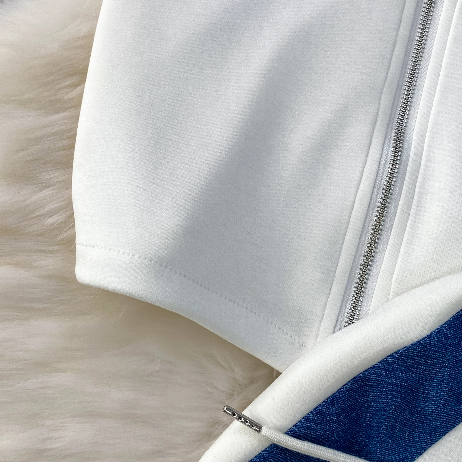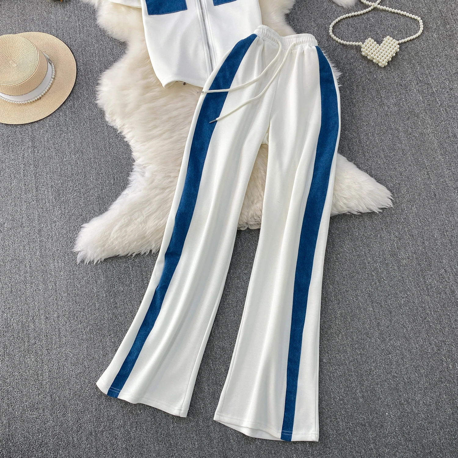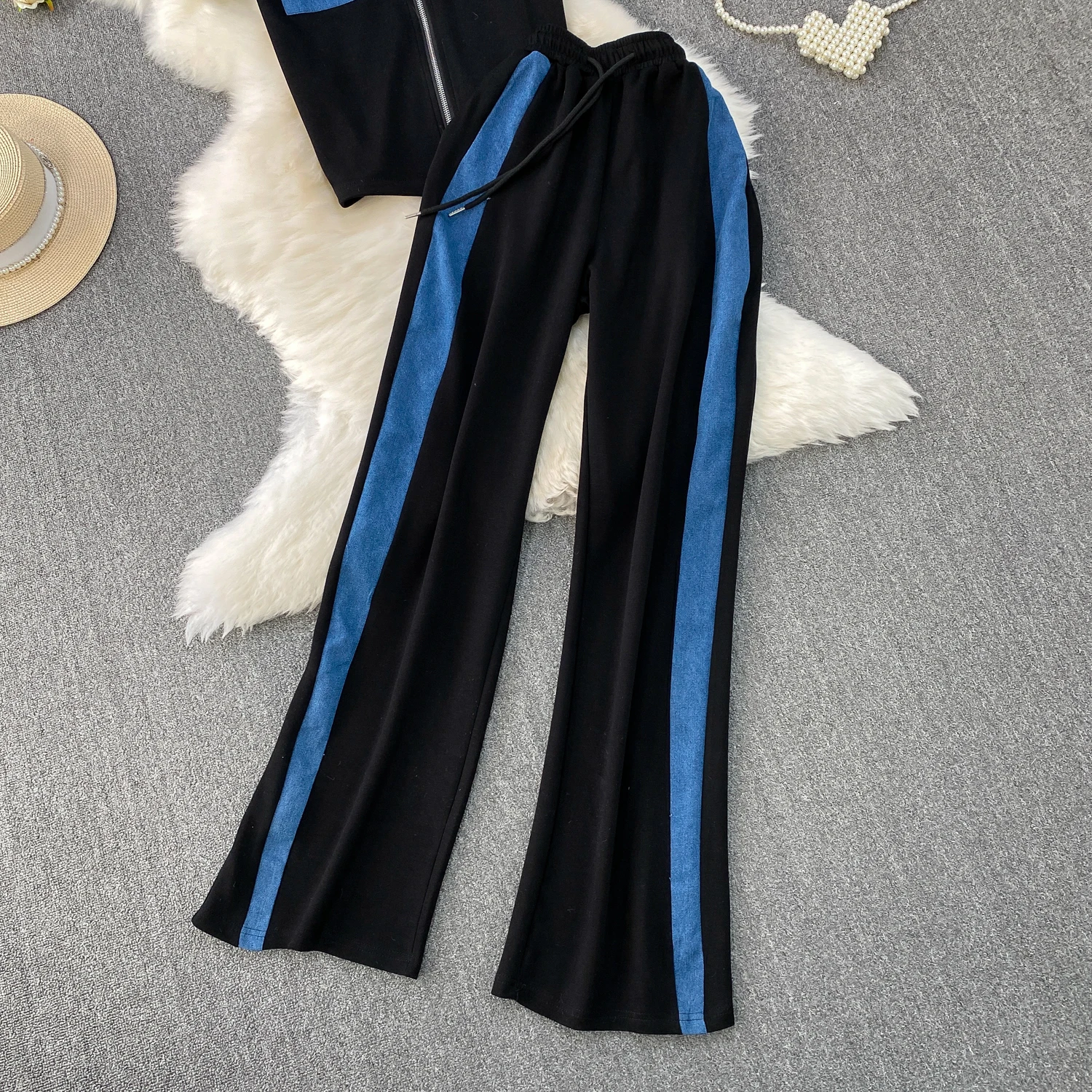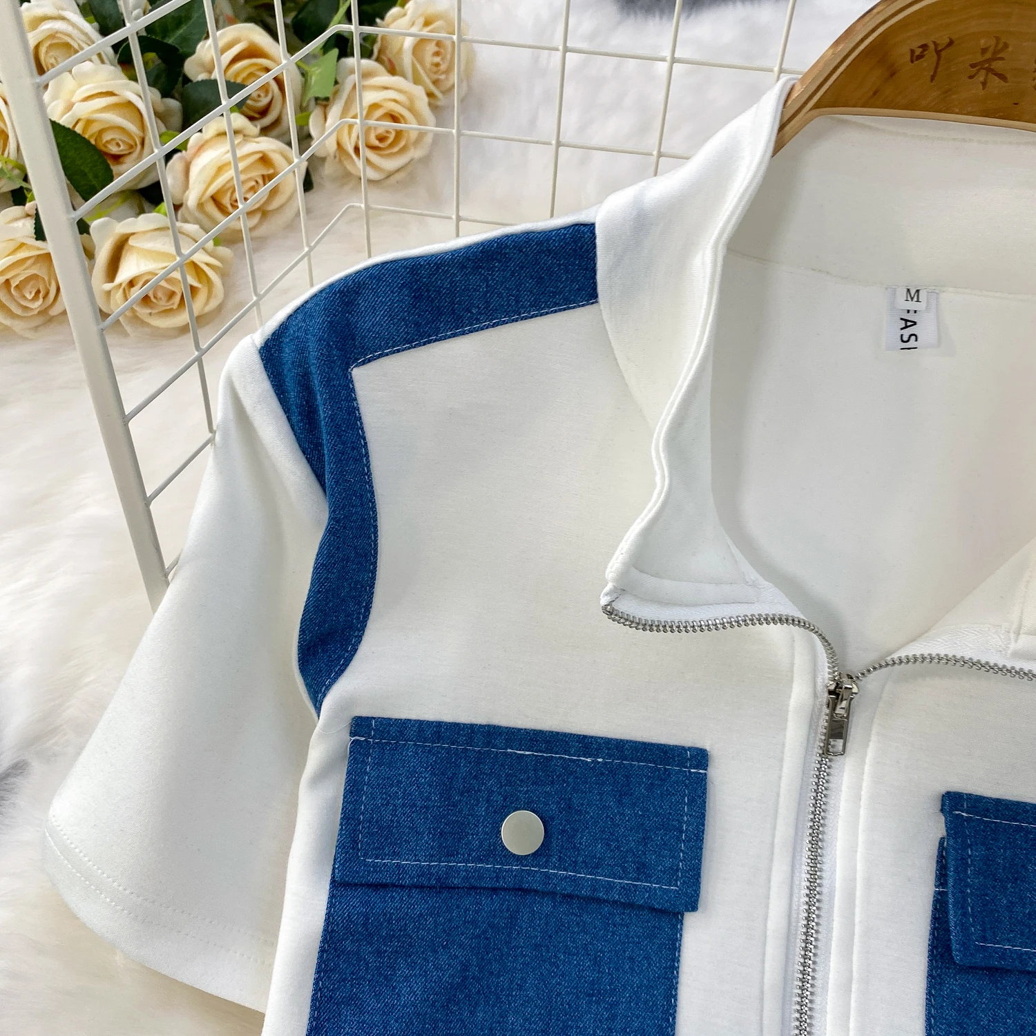 2025 New Casual Zipper Collar ort Sve Patchwork Denim T-irt Top High Waist Slim Wide Leg Pants Two Piece Set Women&