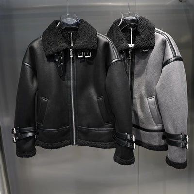 Thiened Winter Flight Jaet Lamb Fur Lined Inteated Leather Metal Bule Design Warm Coat Outerwear for Men