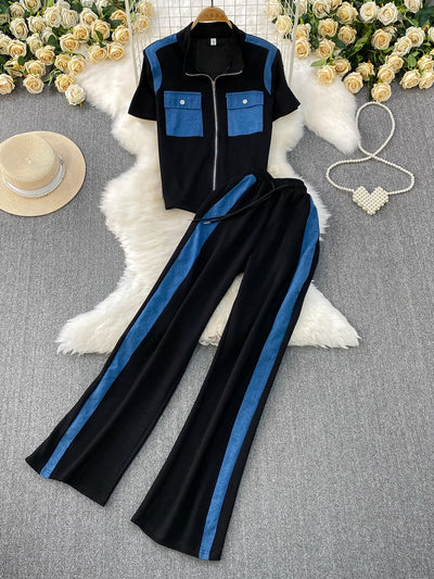 2025 New Casual Zipper Collar ort Sve Patchwork Denim T-irt Top High Waist Slim Wide Leg Pants Two Piece Set Women's F...