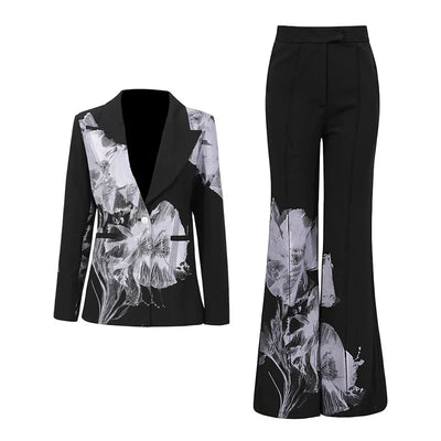 EAEOVNI Flower Printing Design Fashion Set For Women Contrast Color Blazer Coat + Long Pants Elegant 2025 Autumn New Clothing