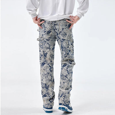 Men Jacquard Weave Denim Jeans Streetwear Ripped Distressed Pants Patch Loose Straight Trousers