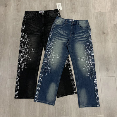 Men Straight jeans Fashion High Street Retro wash Rhinestones Retro Street Style Hip-hop Straight Trousers Streetwear Jeans