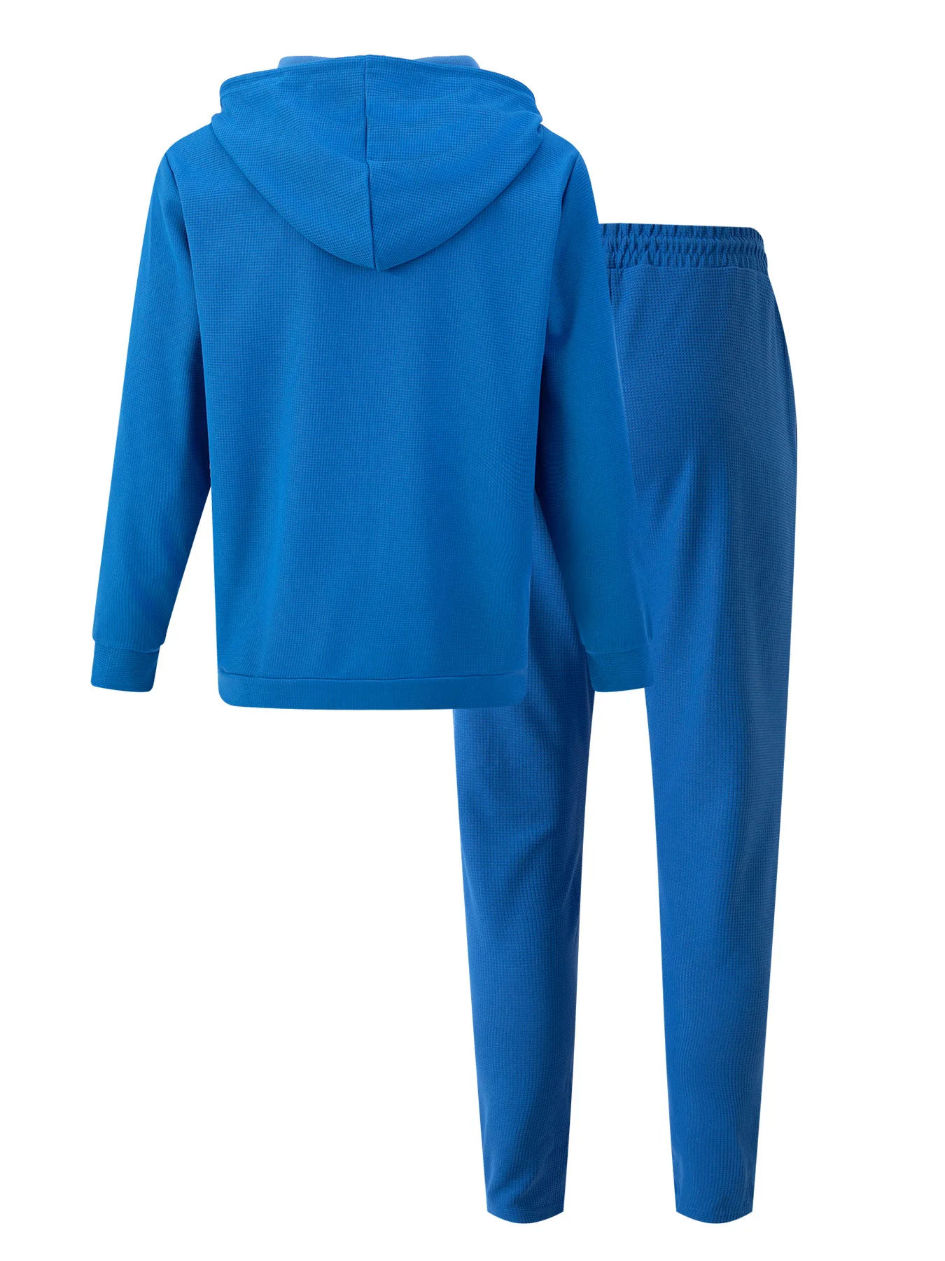 This Men's Solid Color Suit features a trendy waffle hooded pullover and casual zip jacket, perfect for the fashion-forward individual.