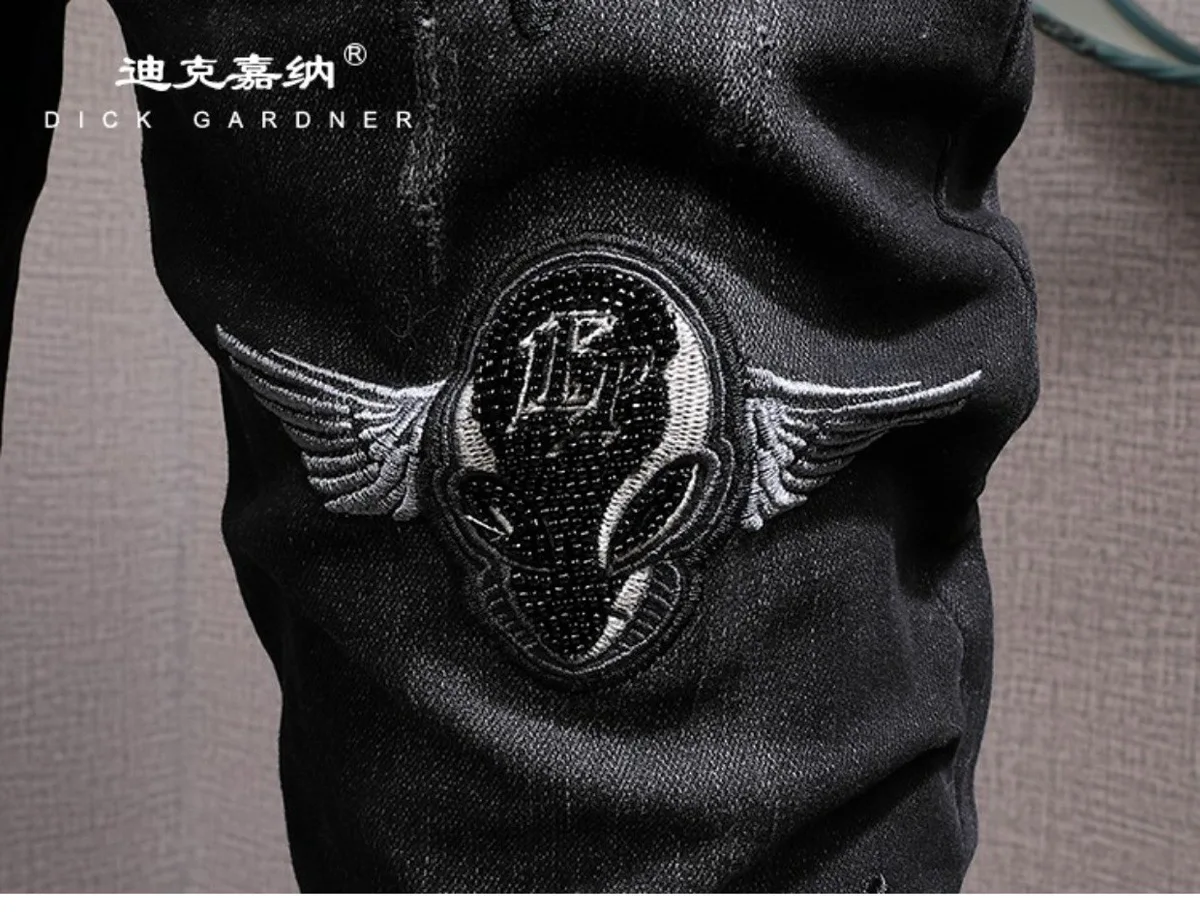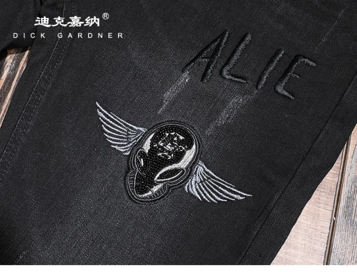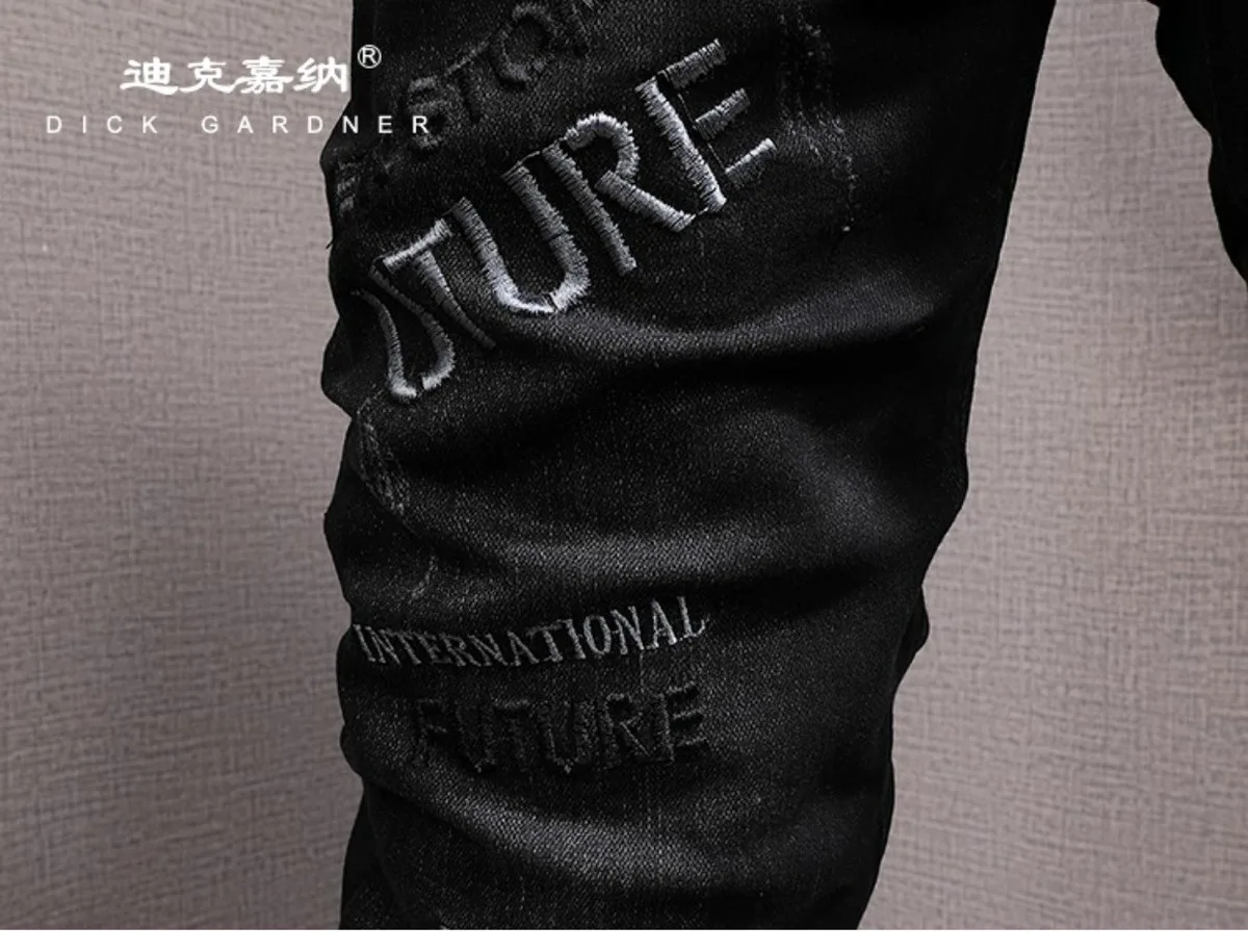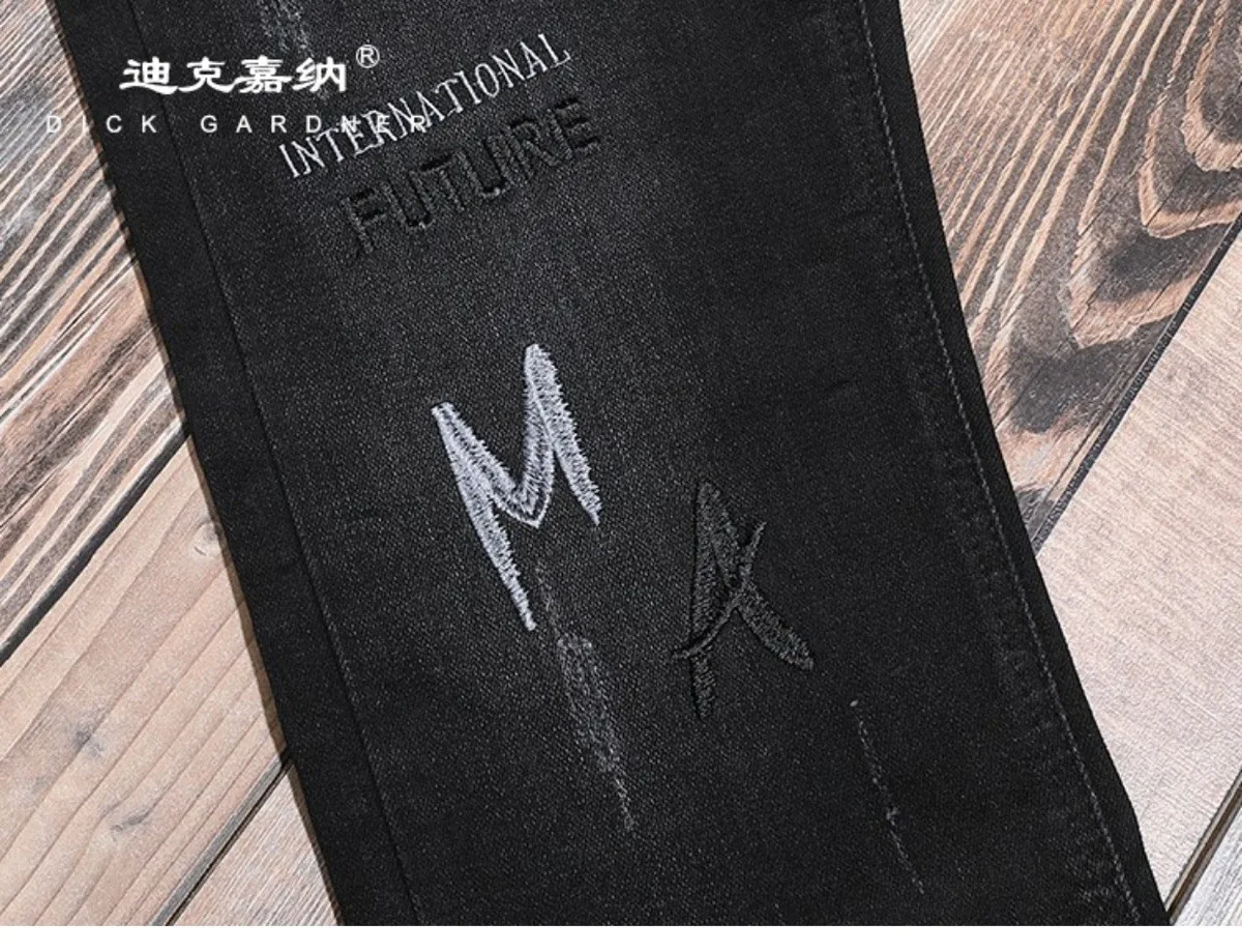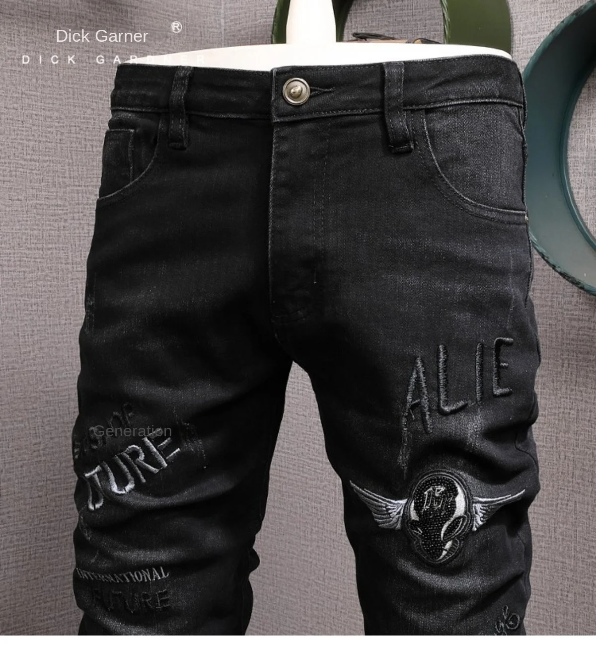 Embroidered printed black jeans for men, fashionable street style slim fit with small feet, trendy stretch denim pants