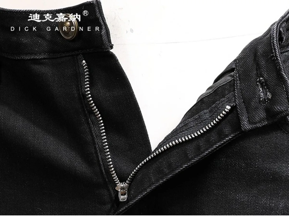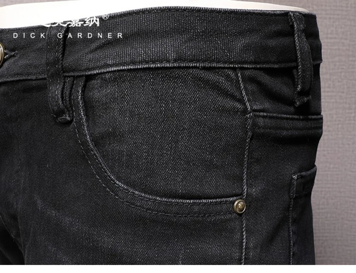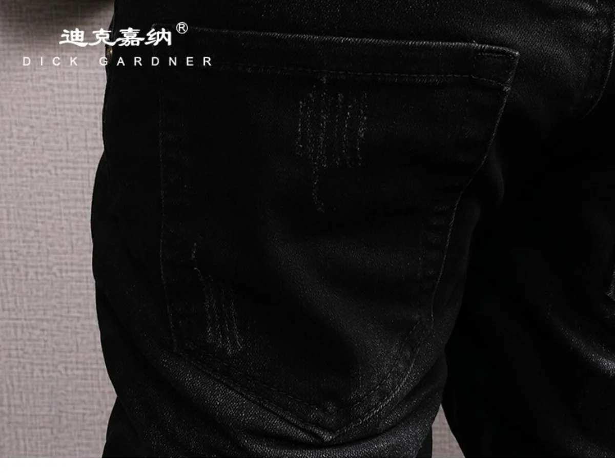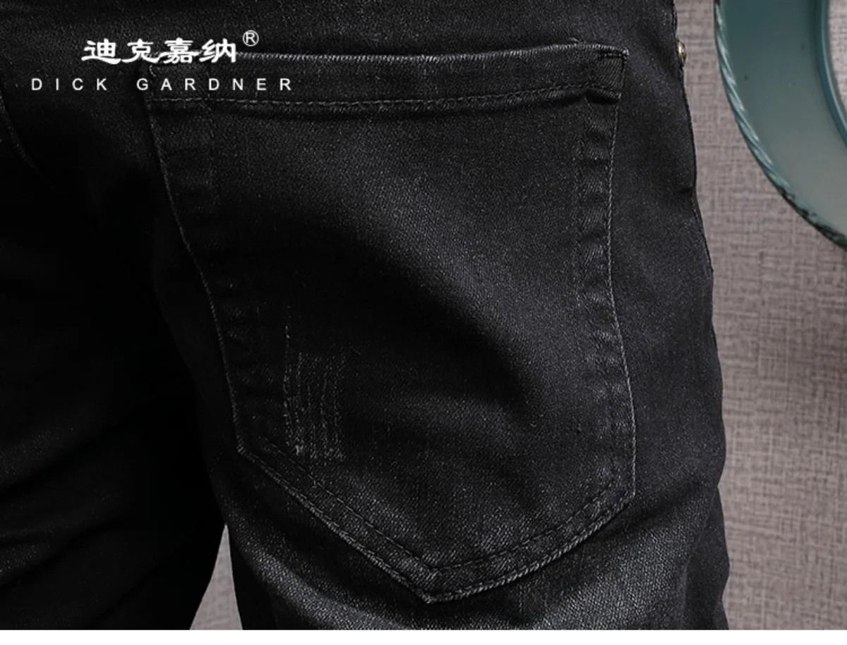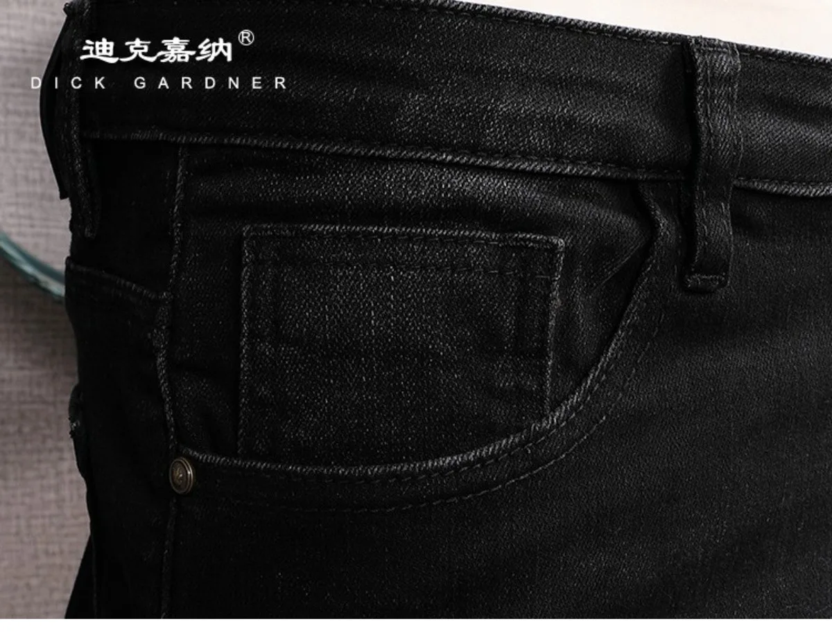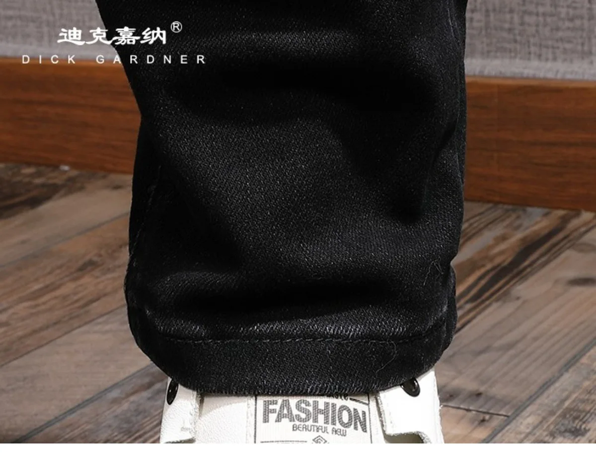 Embroidered printed black jeans for men, fashionable street style slim fit with small feet, trendy stretch denim pants