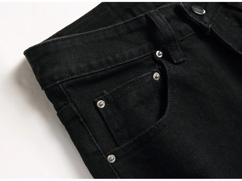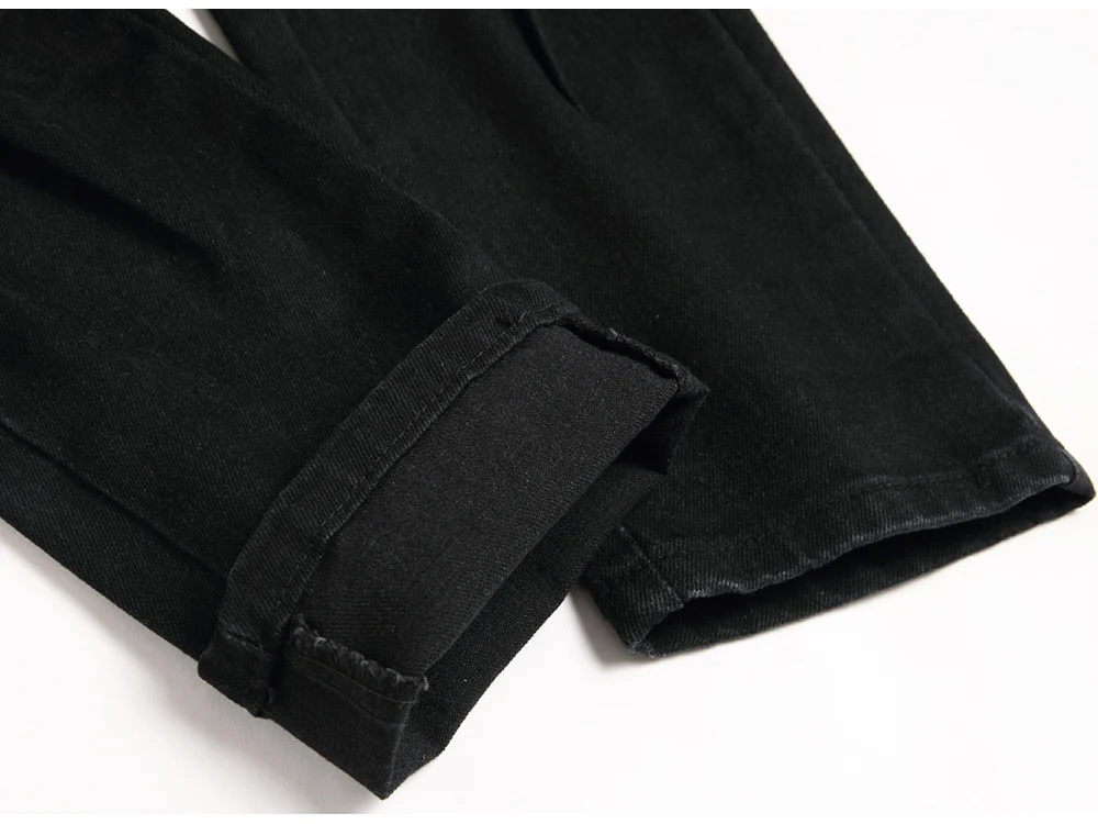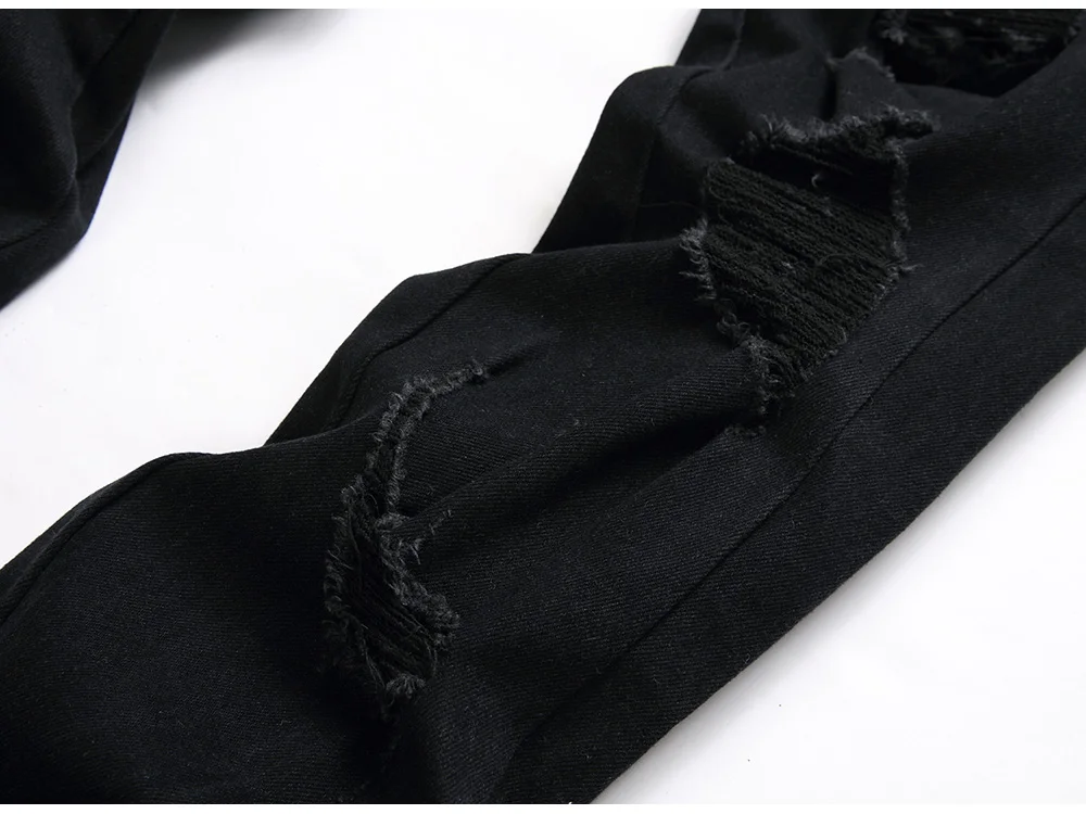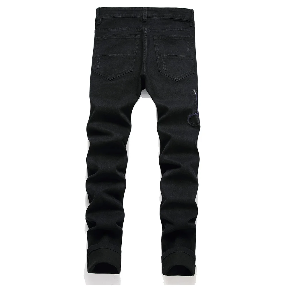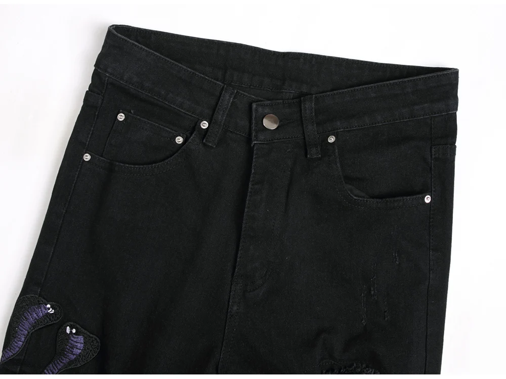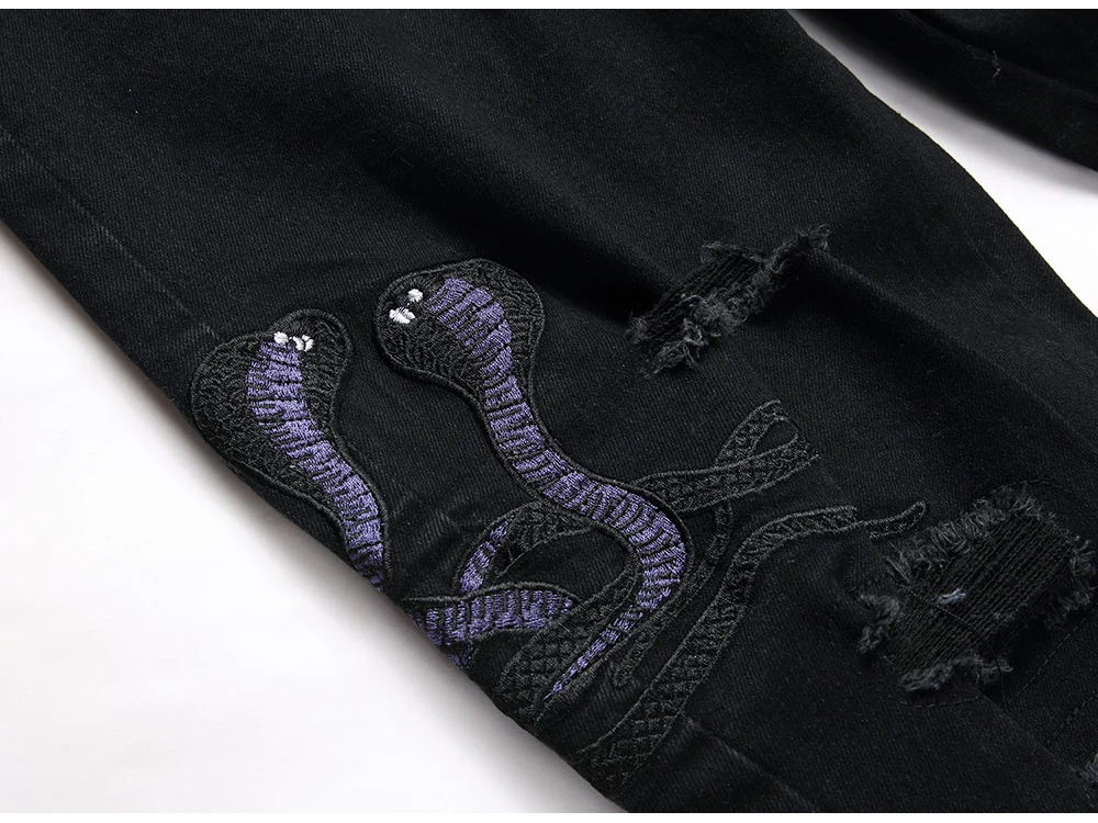 Men Snake Embroidery Jeans Streetwear Black Stretch Denim Pants Holes Ripped Distressed Slim Straight Trousers