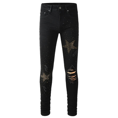 Men Star Crystal Denim Jeans Streetwear Rhinestone Skinny Tapered Pants Holes Ripped Black Stretch Trousers