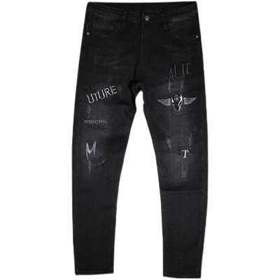 Embroidered printed black jeans for men, fashionable street style slim fit with small feet, trendy stretch denim pants