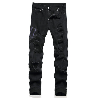 Men Snake Embroidery Jeans Streetwear Black Stretch Denim Pants Holes Ripped Distressed Slim Straight Trousers