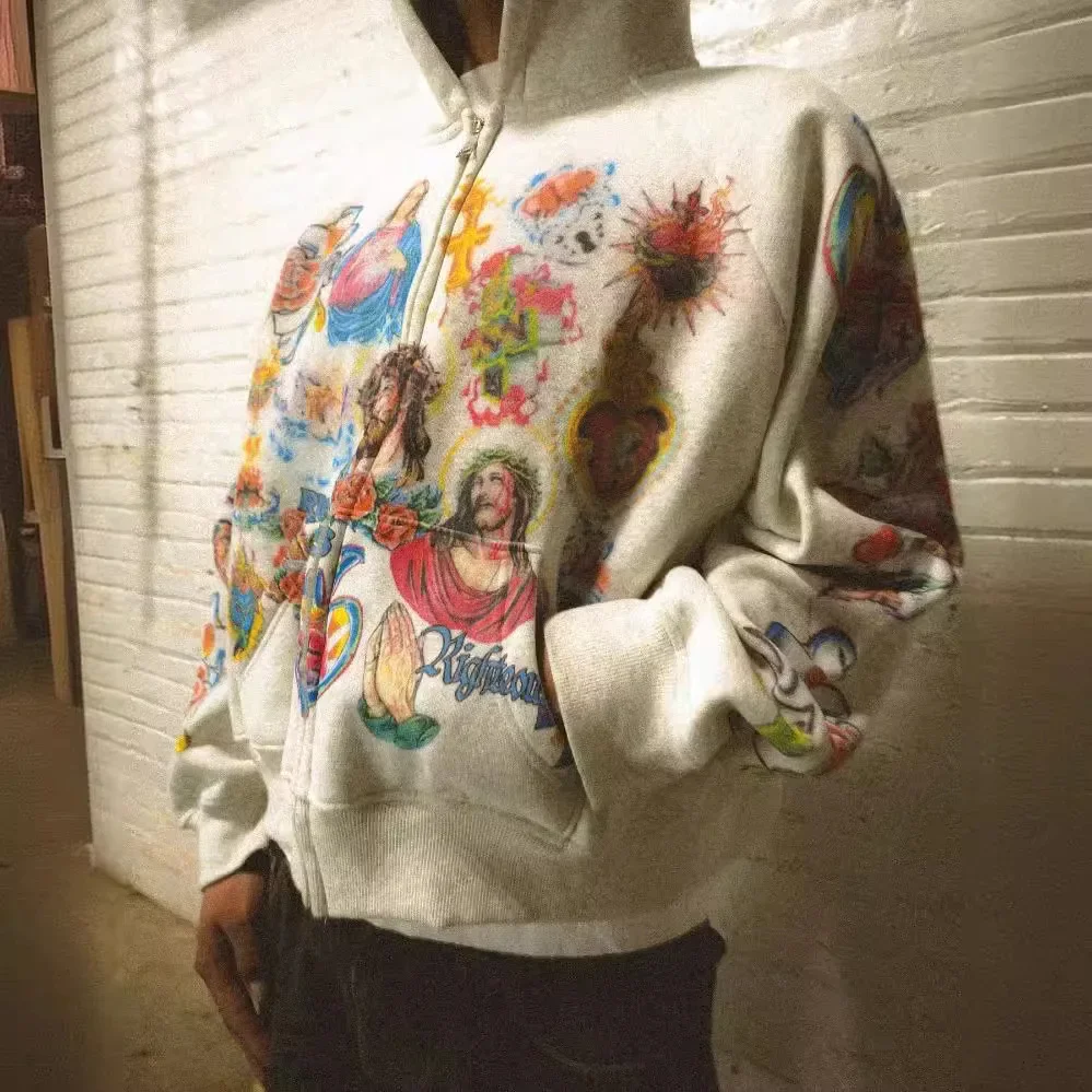 Fmxires2025 Street Casual Clothing Retro Pattern Printed Hoodie Loose Temperament Men&