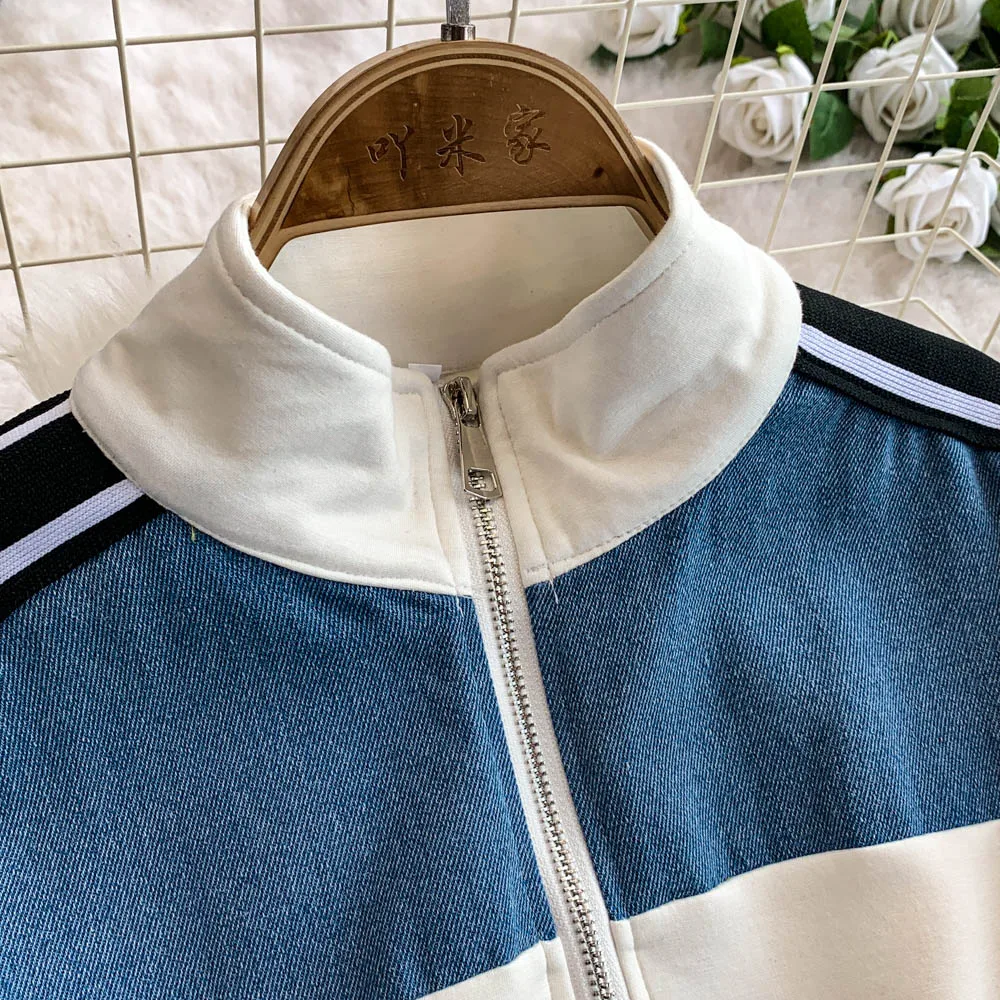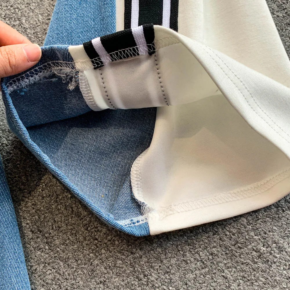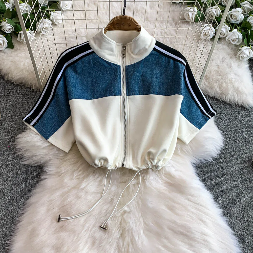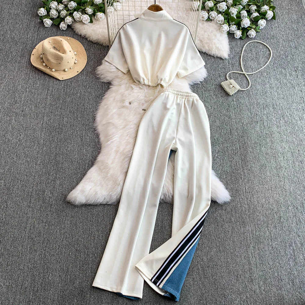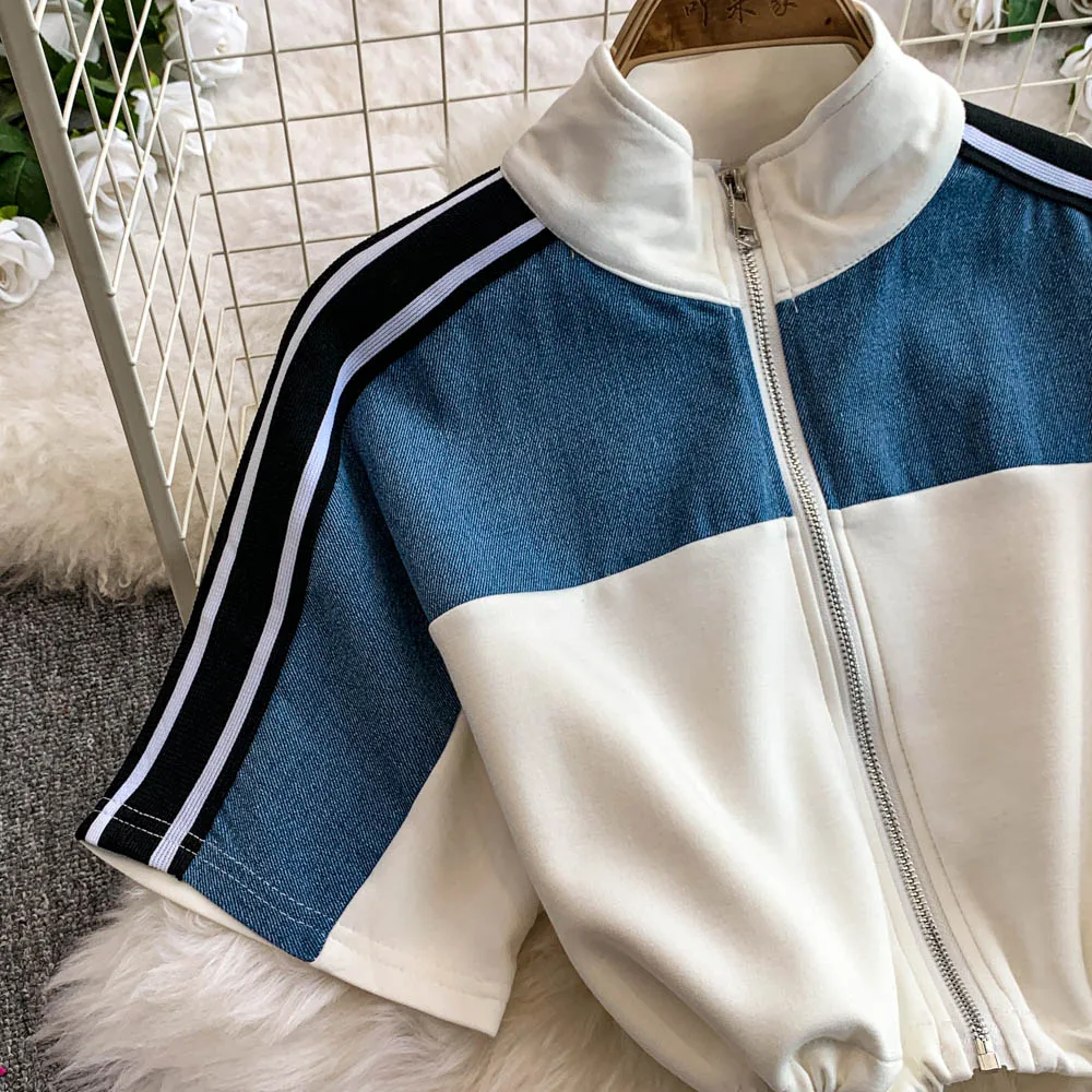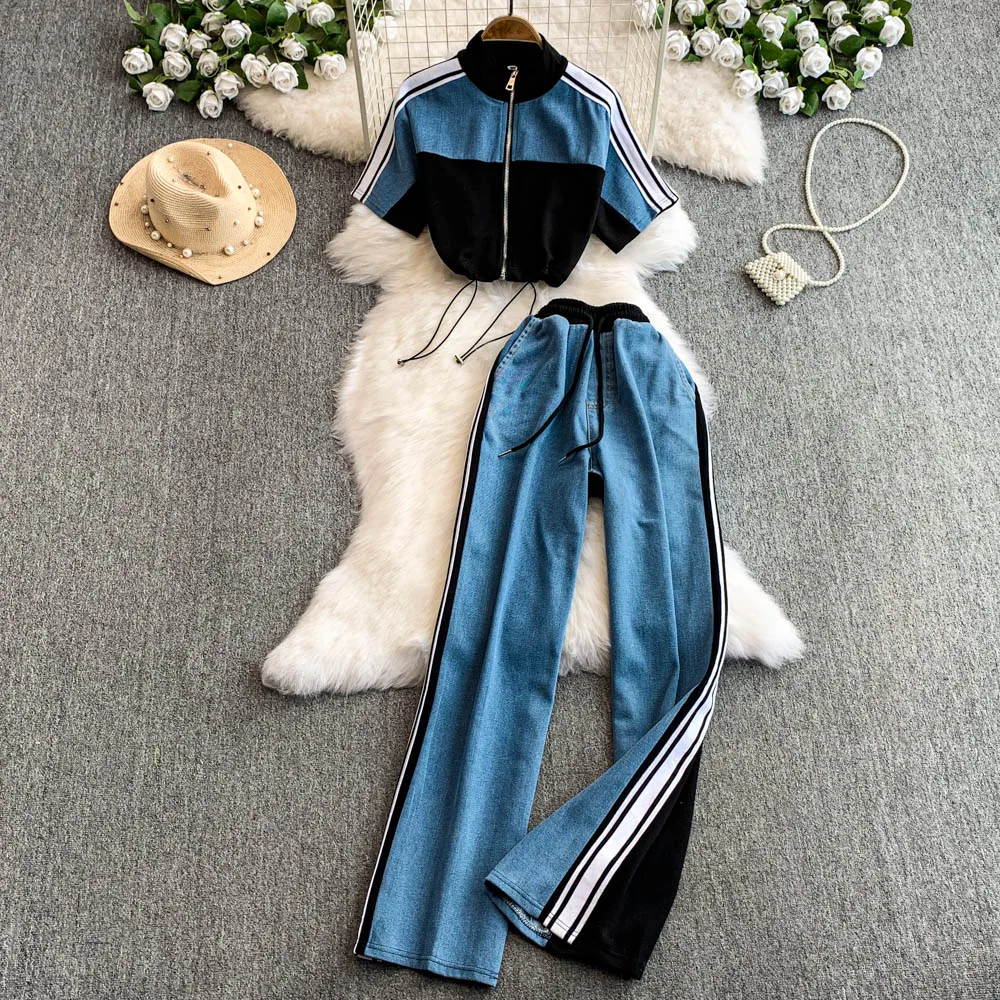 Hong Kong Sle Retro Set Women's Stand Collar ort Sve T-irt Denim Patchwork Loose Elastic Waist Straight Leg Pants
