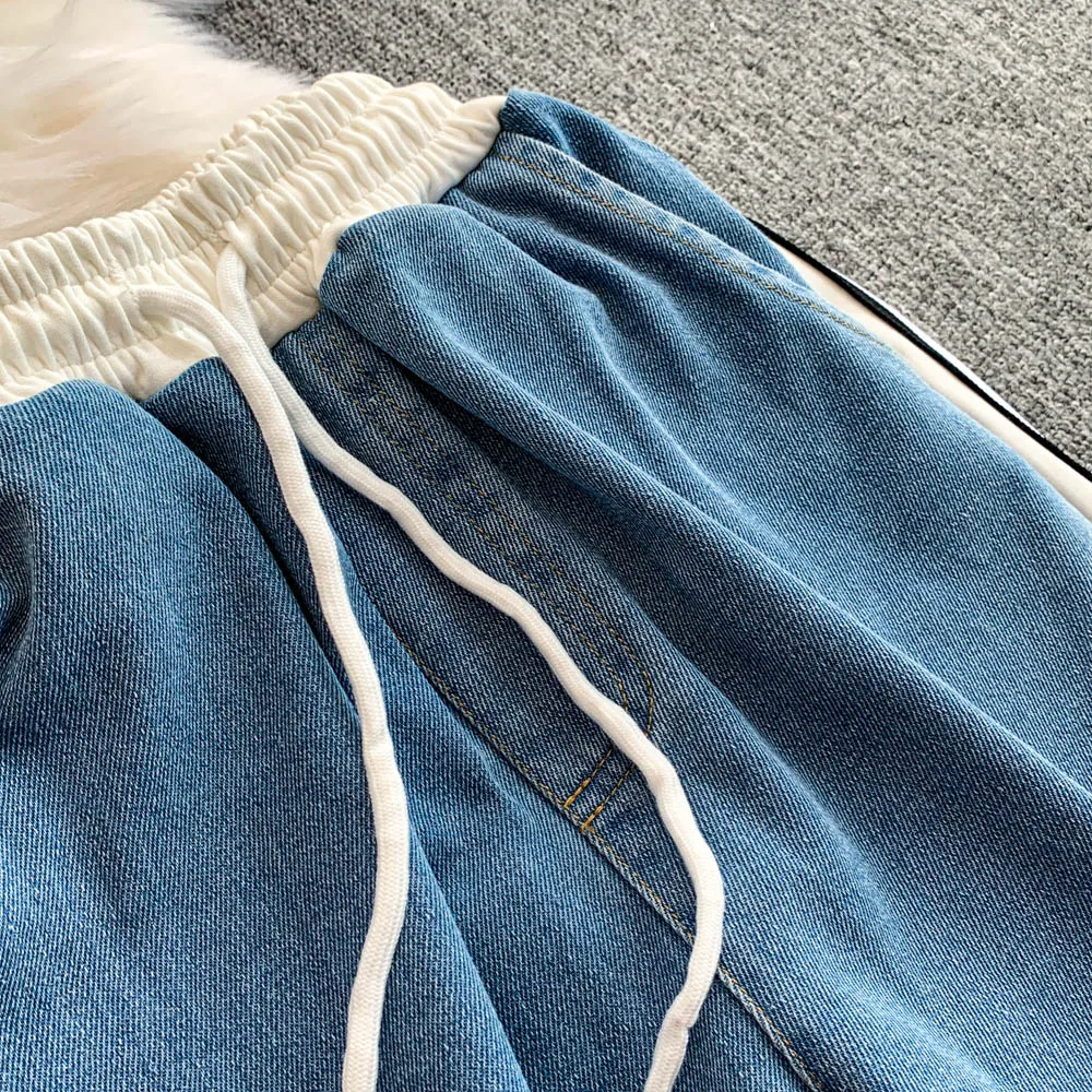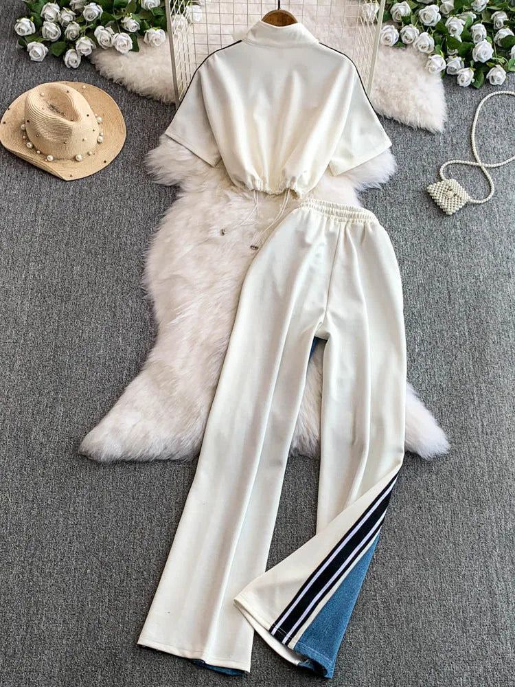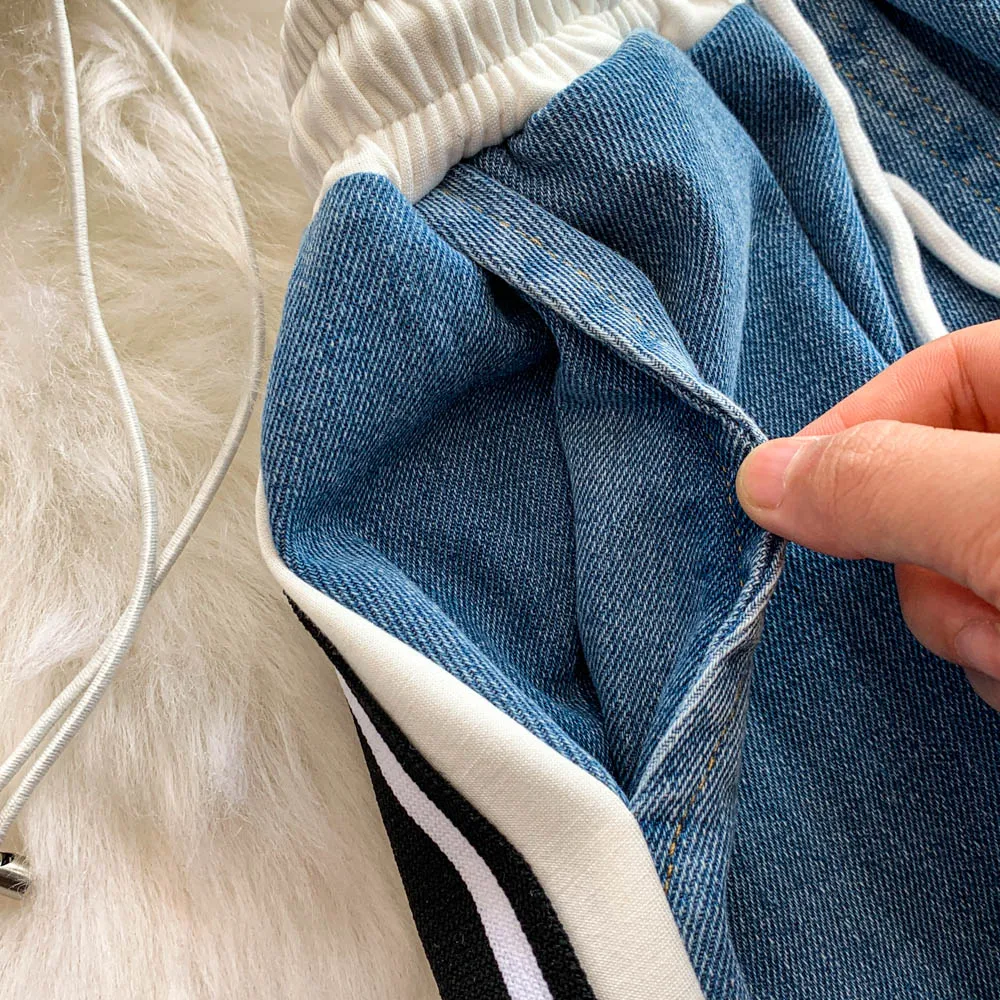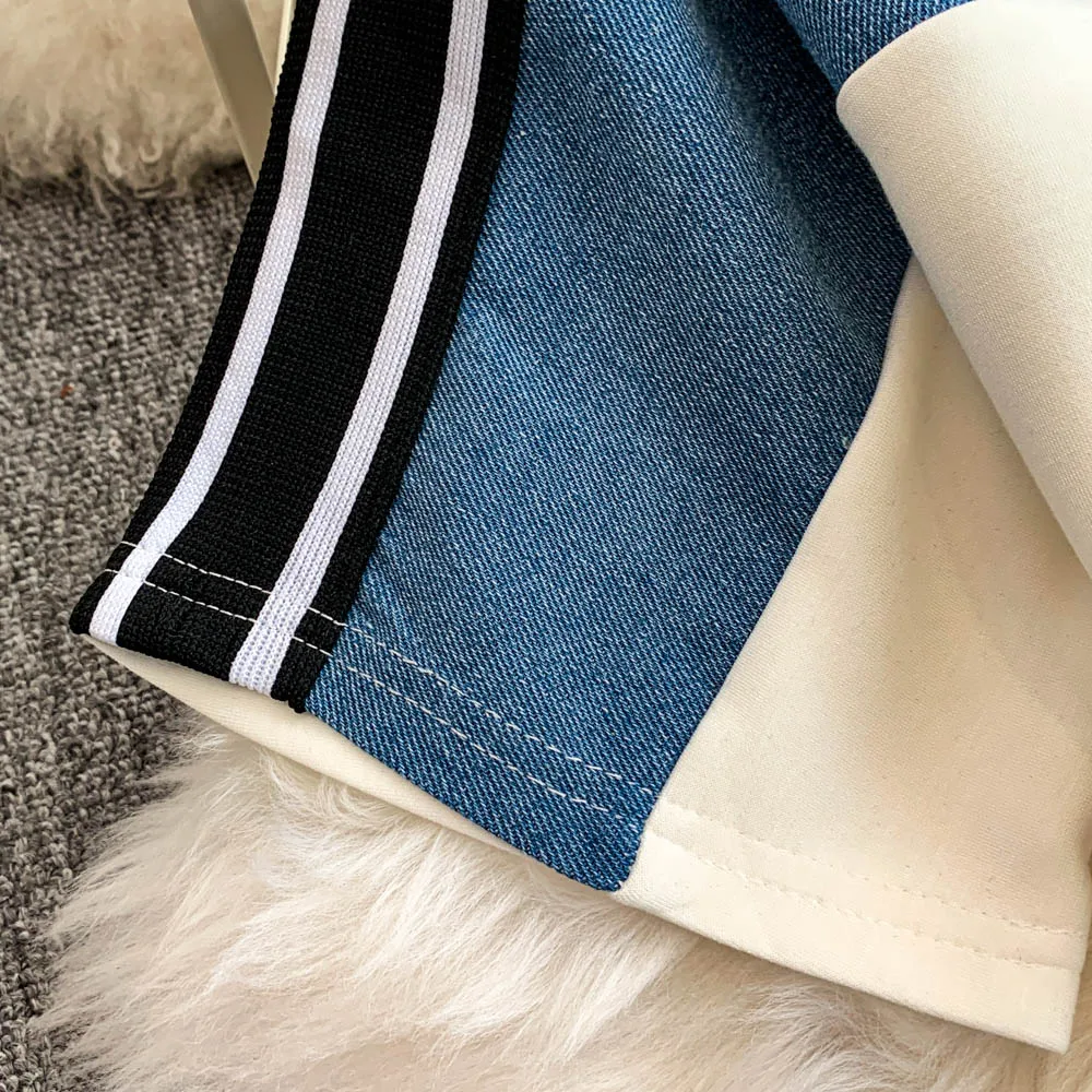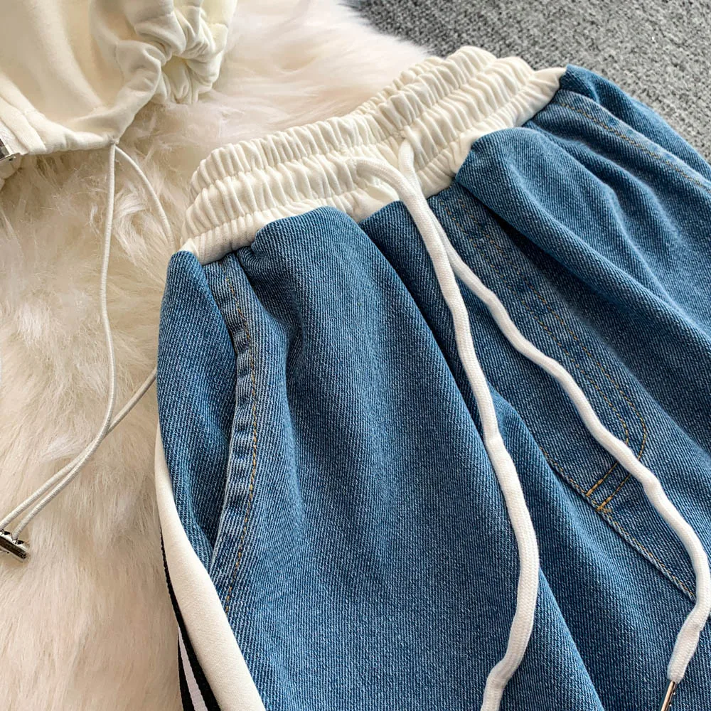 Hong Kong Sle Retro Set Women's Stand Collar ort Sve T-irt Denim Patchwork Loose Elastic Waist Straight Leg Pants
