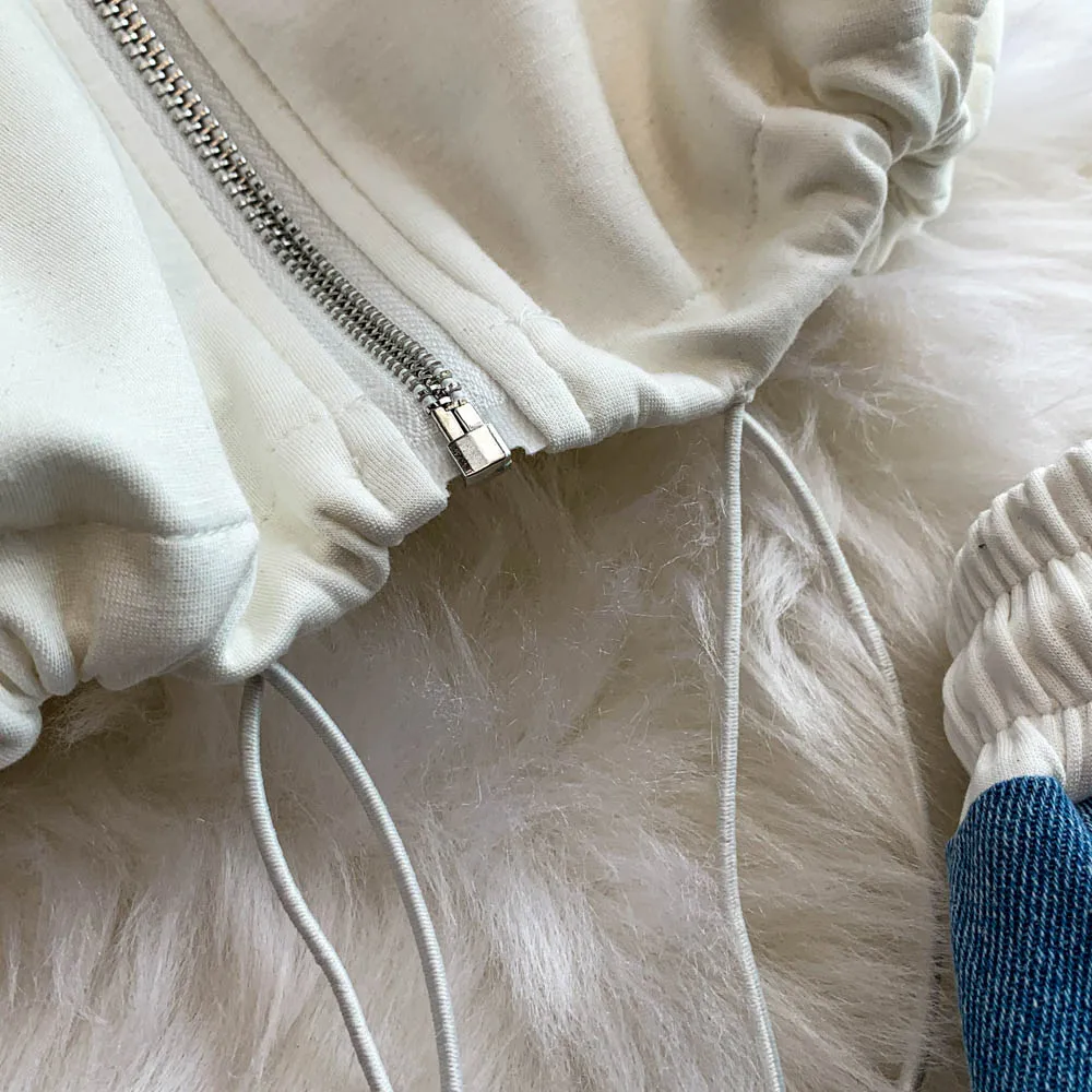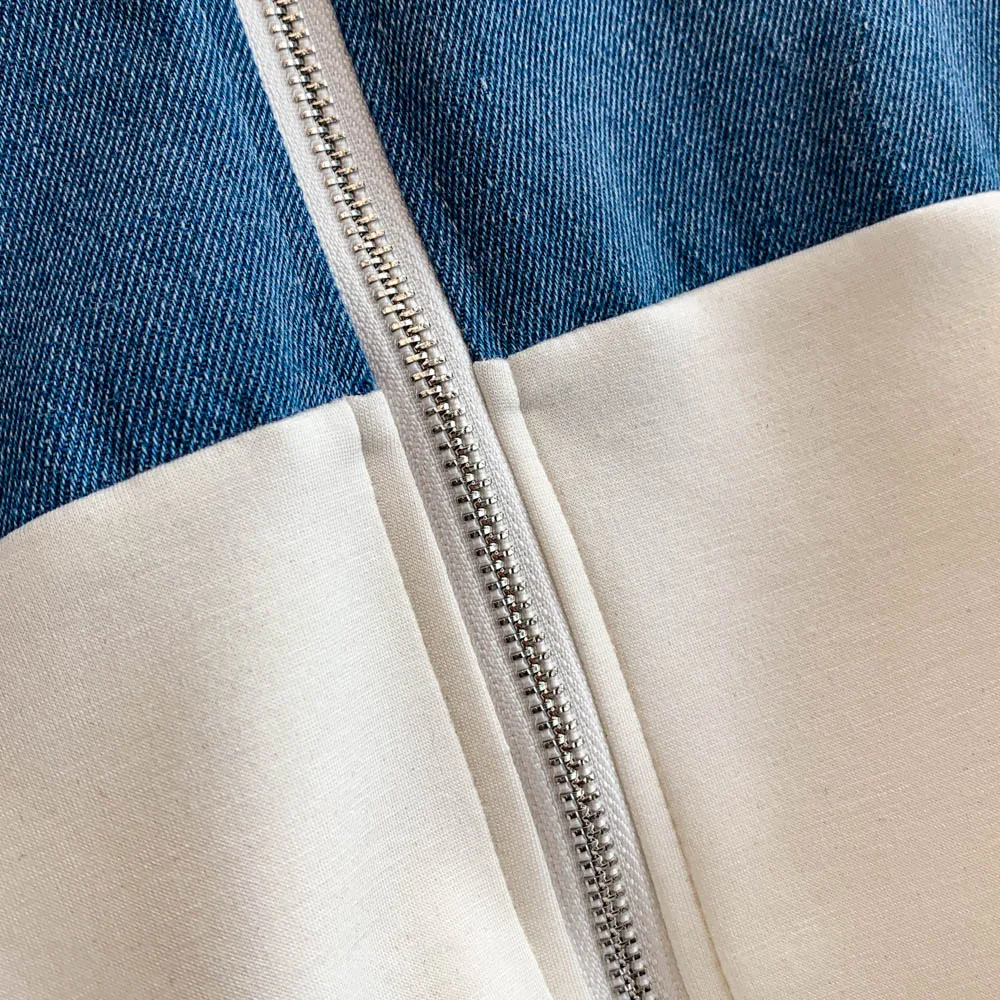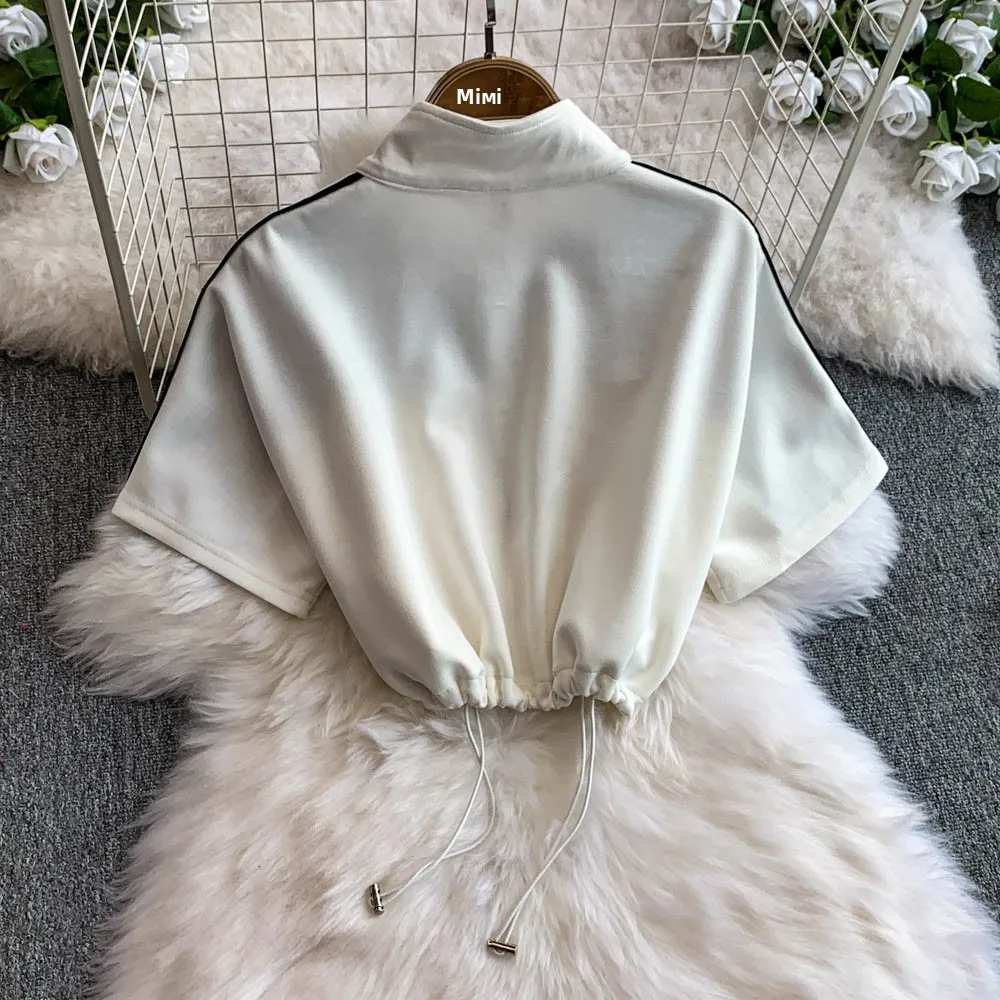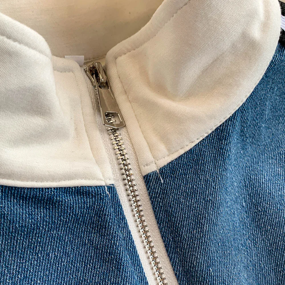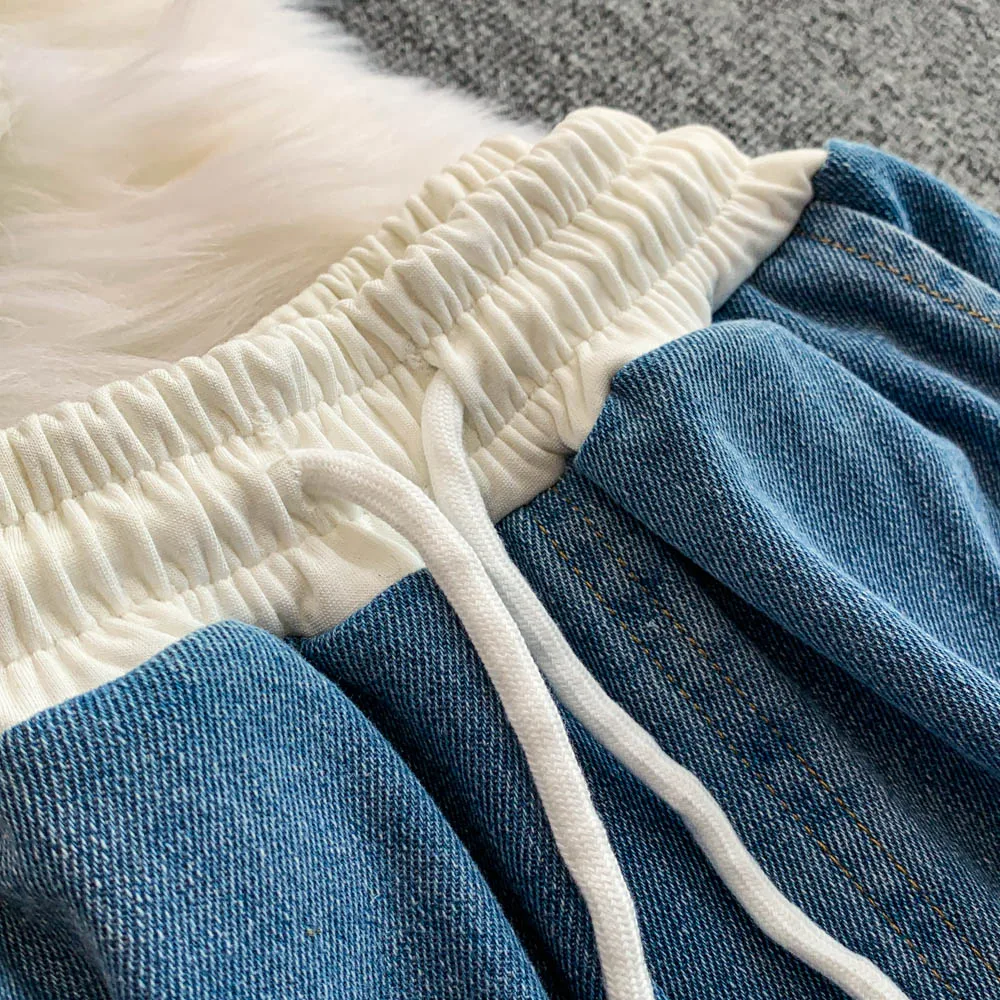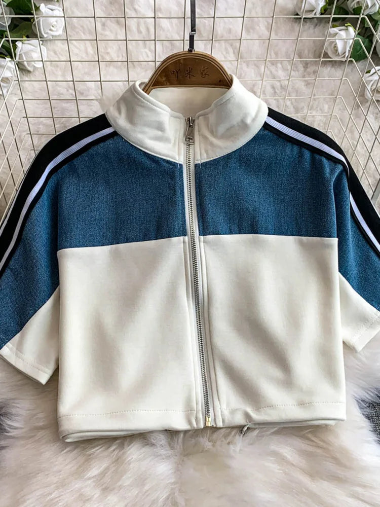 Hong Kong Sle Retro Set Women's Stand Collar ort Sve T-irt Denim Patchwork Loose Elastic Waist Straight Leg Pants