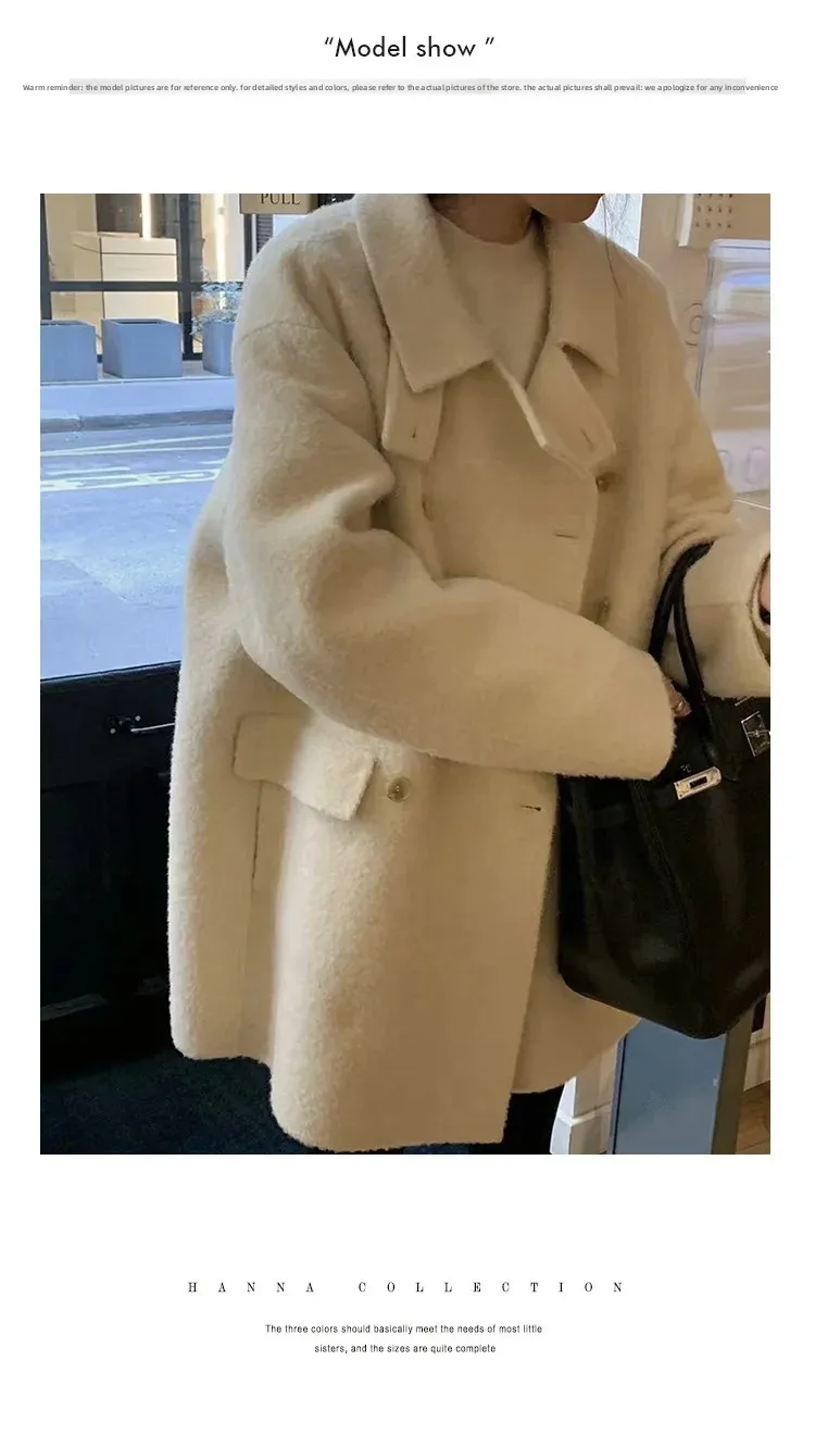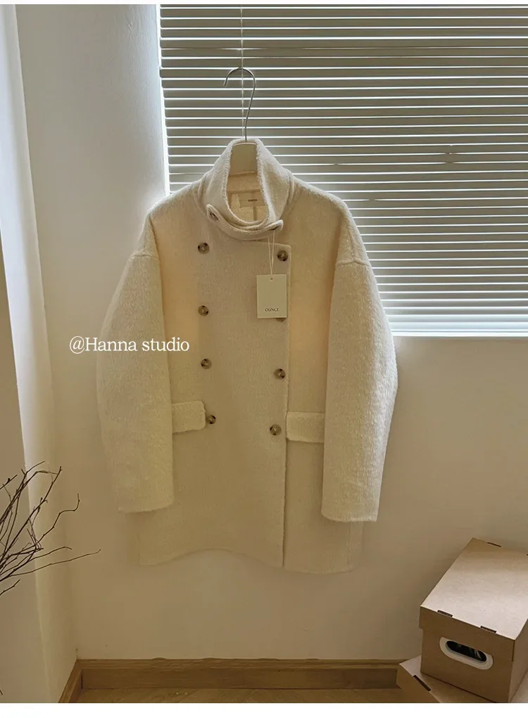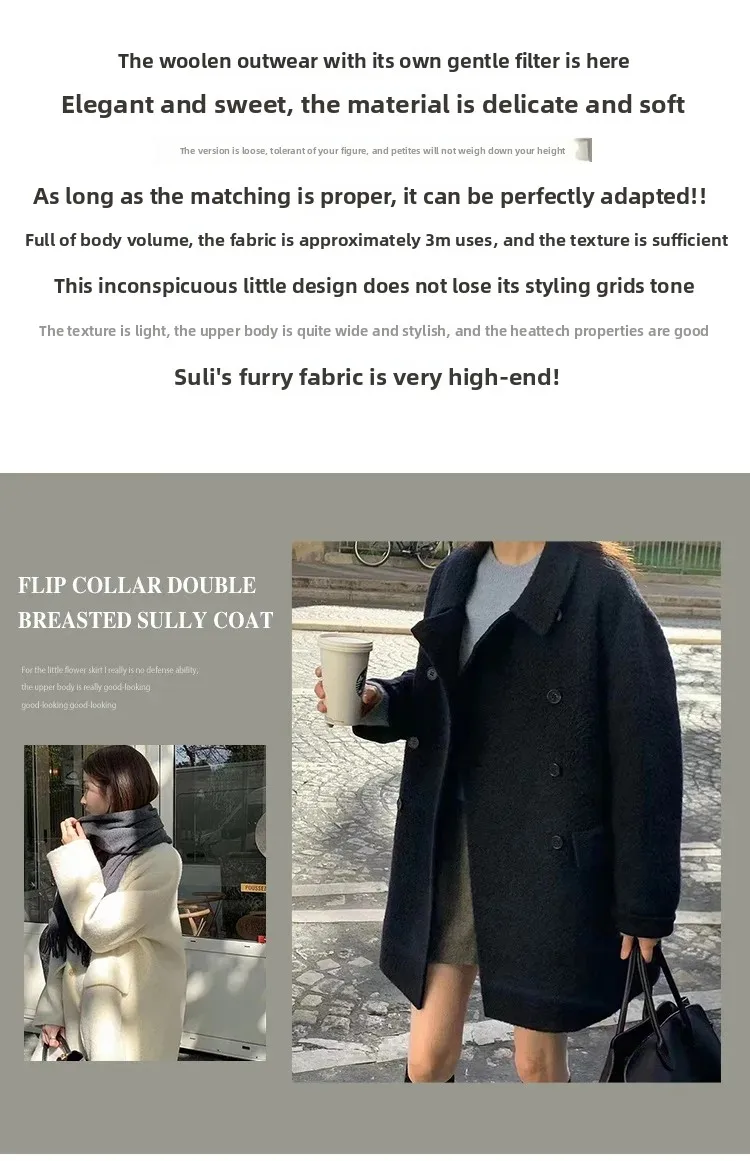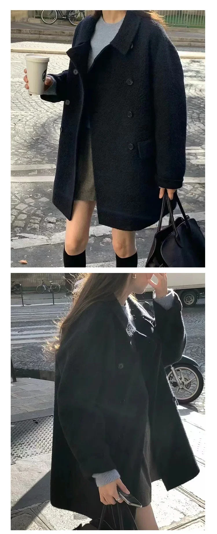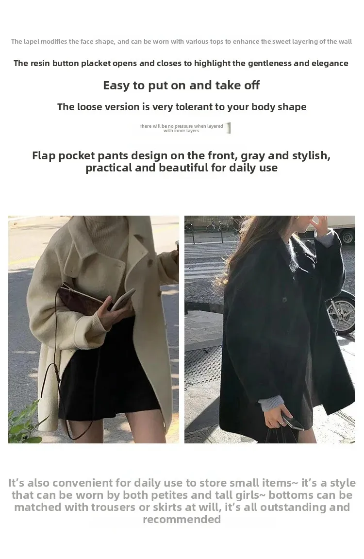 Korean Dongdaemun OUN*CE French Style Loose Gentle Collar Double Button Woolen Coat Medium Length Outerwear Women's Cardigan