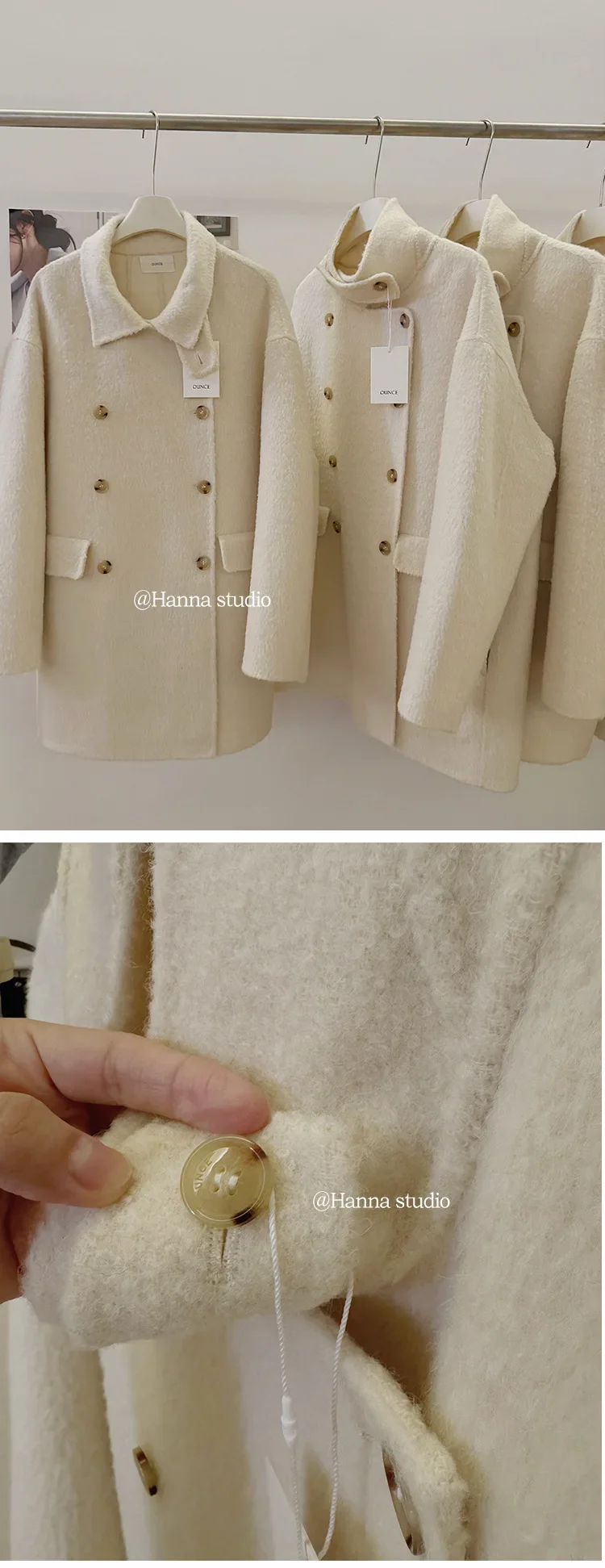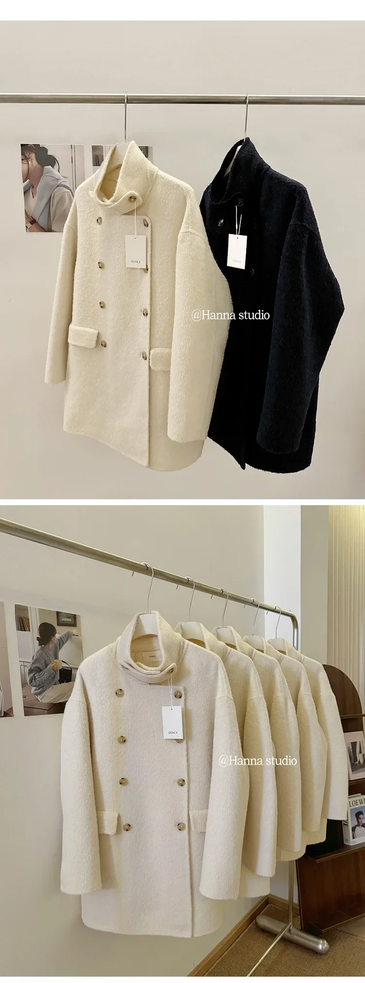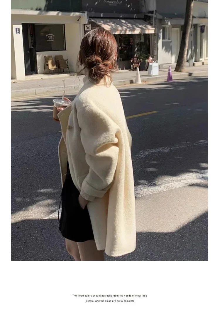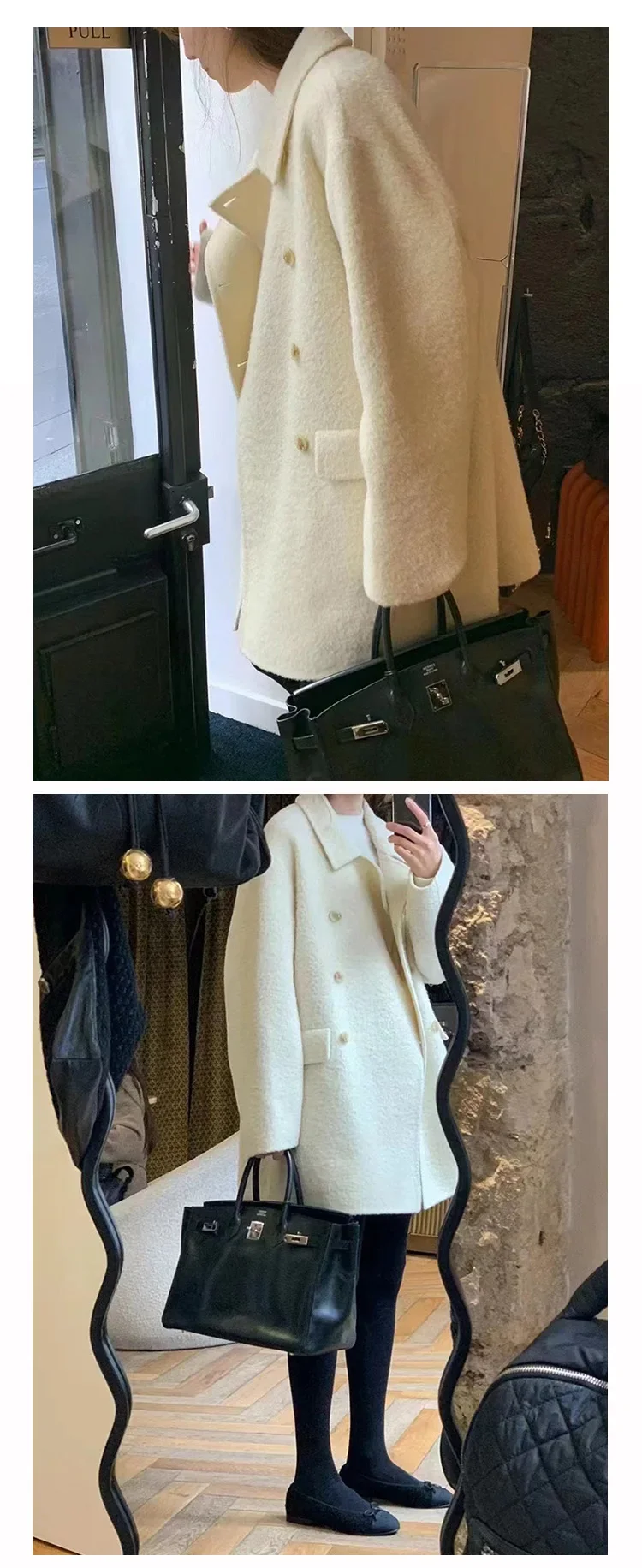 Korean Dongdaemun OUN*CE French Style Loose Gentle Collar Double Button Woolen Coat Medium Length Outerwear Women's Cardigan