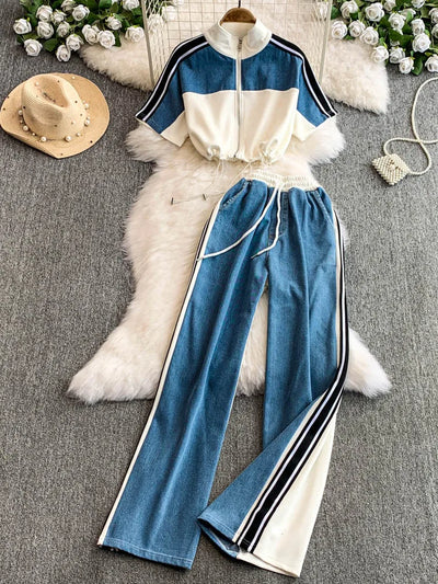 2025 New Casual Zipper Collar ort Sve Patchwork Denim T-irt Top High Waist Slim Wide Leg Pants Two Piece Set Women's F...